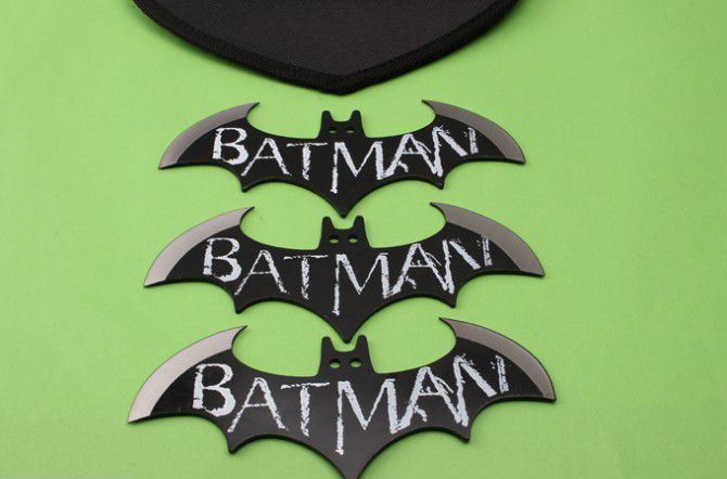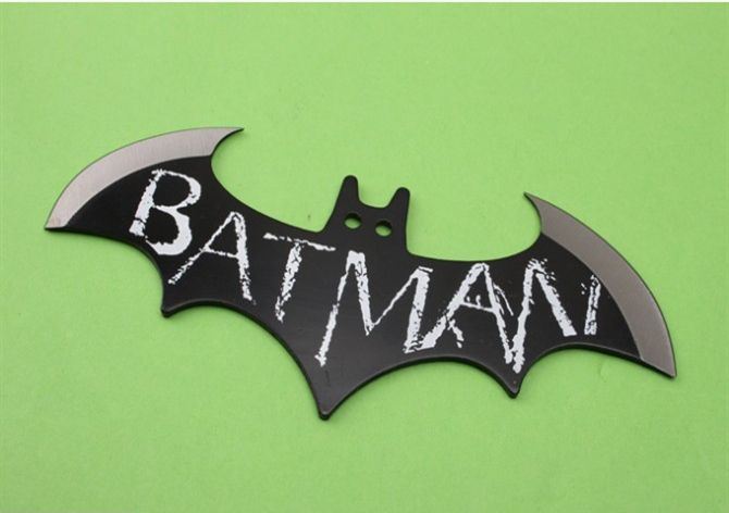 蝙蝠侠飞镖 钢材:3Cr13Mov 长度:14.9cm 刃宽:5.5cm(一边) 刃厚:2.5cm 总重:281g(含包装) 表面:氧化黑色+ 刀套:尼龙套 其它:三支装