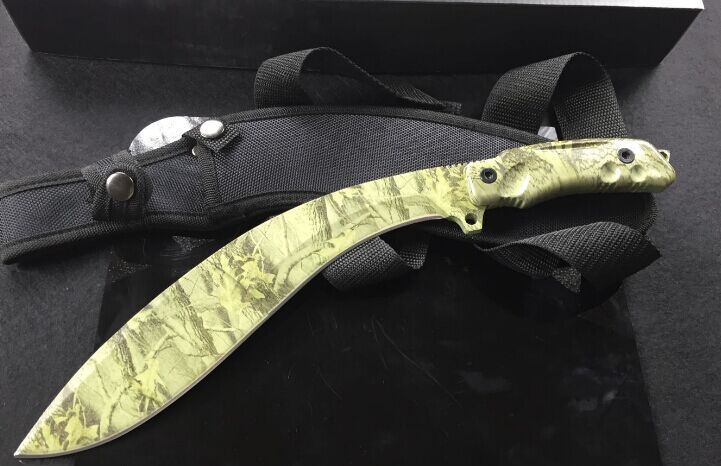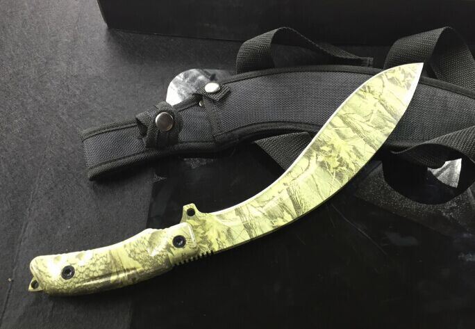 狐狸狗腿(迷彩版) 全长:39.5cm 刃长:27.5cm 刃宽:4.8cm(最宽处) 刃厚:0.5cm 刃材:440c 硬度:57HRC 表面:高温批复 柄材:橡胶 刀重:500克 总重:810克(含刀套和包装物) 附件:尼龙刀套、挂带