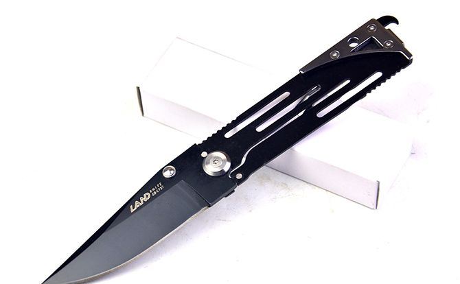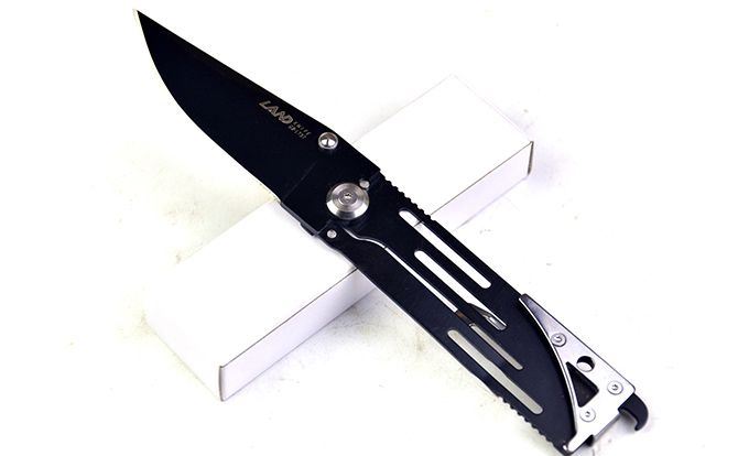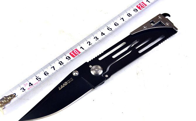 LAND乐土折刀 全 长:20.5cm 刃 长:8.5cm 刃 宽:3.0cm(最宽处) 刃 厚:2.9mm 柄 长:12.5cm 表 面: 发黑 刃 材: 440 硬 度: 57HRC 柄 材: 全钢 总 重; 90克(含盒子) 锁 闭:线锁 备 注:带腰夹