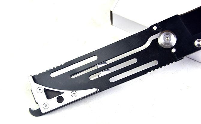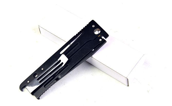 全 长:20.5cm 刃 长:8.5cm 刃 宽:3.0cm(最宽处) 刃 厚:2.9mm 柄 长:12.5cm 表 面: 发黑 刃 材: 440 硬 度: 57HRC 柄 材: 全钢 总 重; 90克(含盒子) 锁 闭:线锁 备 注:带腰夹