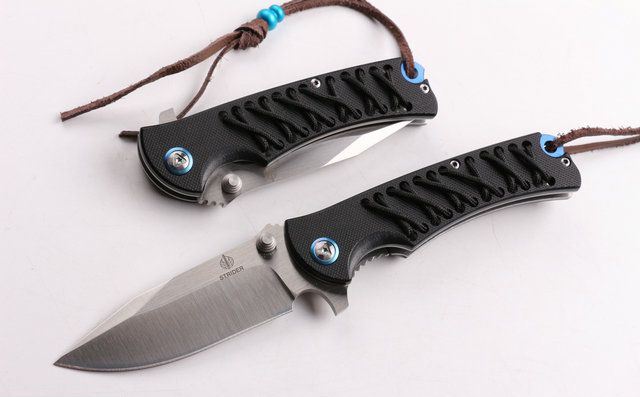 挺进者PE扎绳折刀 全 长:200mm 刃 长:87mm 柄 长:113mm 刃 宽:28mm 刃 厚:4.0mm 刃 材:9CR18MOV 重 量:150g(含包装) 硬 度:57HRC 表 面:沙光伴拉丝 柄 材:全钢+G10穿黑绳子 锁 型:线锁 其 他:配厂盒