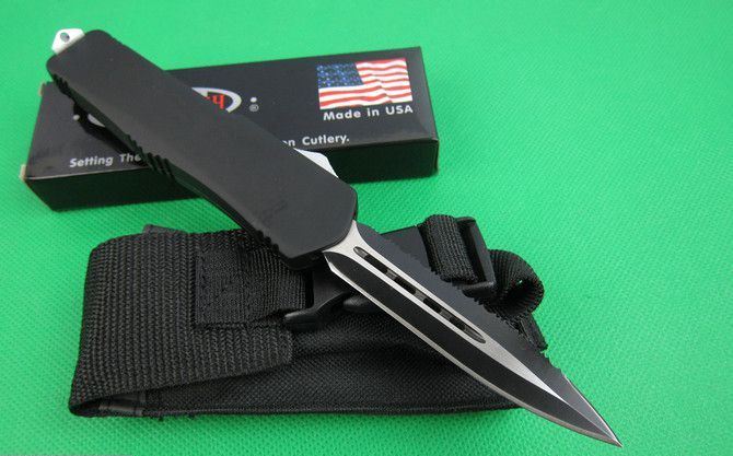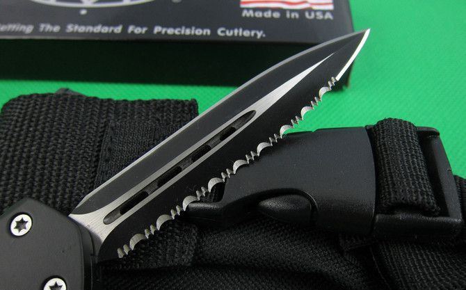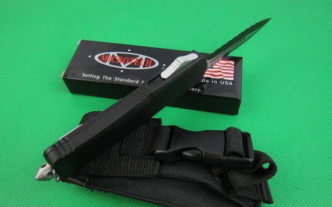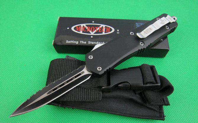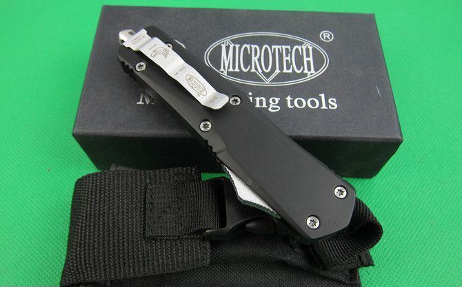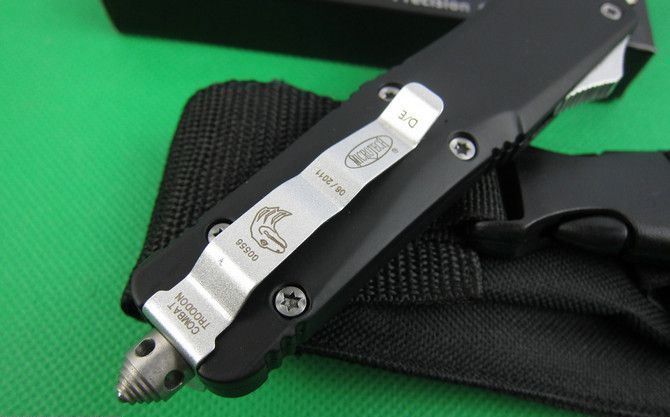微技术伤齿龙A07单锋边齿(黑刃) 全 长: 23.0cm (含尾锥长度) 刃 长: 9.0cm 刃 厚: 3mm 刃 材: 440 硬 度: 57HRC 刀净重:230克 总重量: 350克(含包装物) 表 面: 黑钛伴拉丝 柄 材: 锌铝合金 刀 鞘: 尼龙 锁 闭: 弹簧直出 备 注:带背夹和玻璃撞针