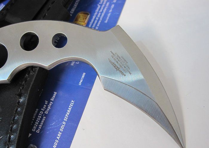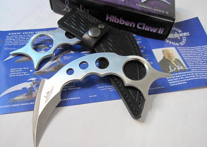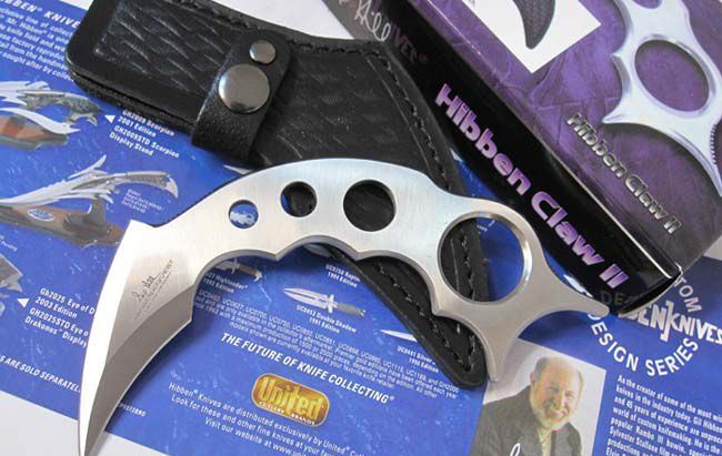 联合刀具United-铁爪II号(OEM正品) 全长:15.5cm (刀身弧型,只能取直径量度) 刃长:7cm(双刃开锋) 刃宽:3cm 刃厚:0.42cm 刃材:440 硬度:57HRC 表面:七彩丝光(刀身表面可反光出七彩光线) 柄材:全钢 净重:100克 毛重:250克(含包装物) 刀鞘:压花牛皮刀套,带有不锈钢腰夹,可夹在腰带上携带方便。