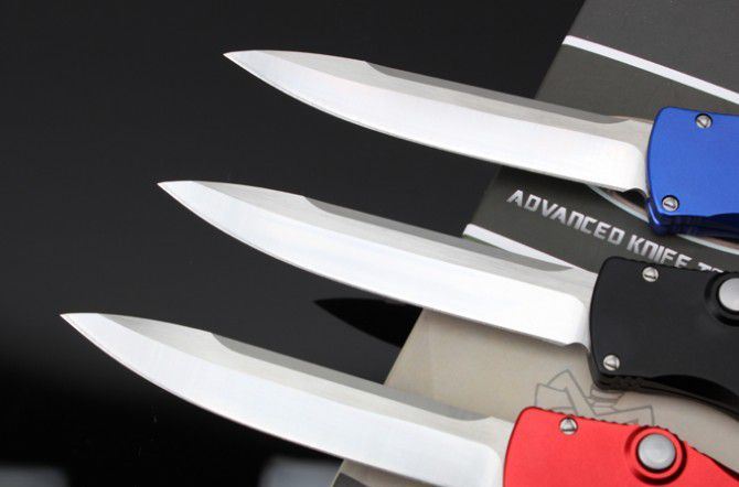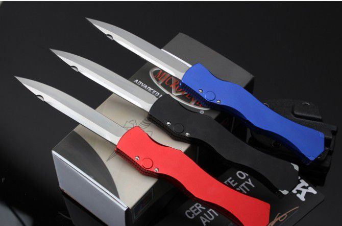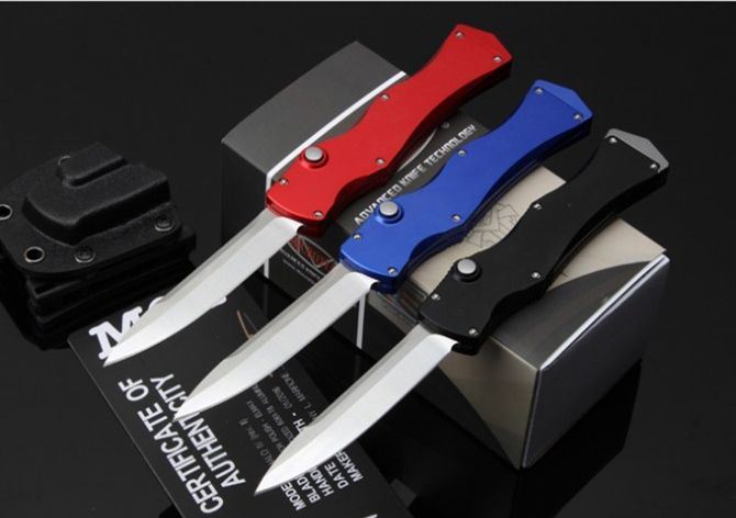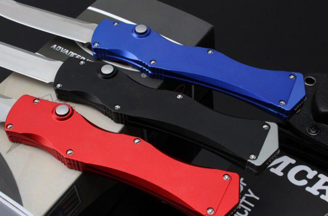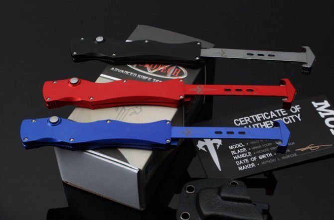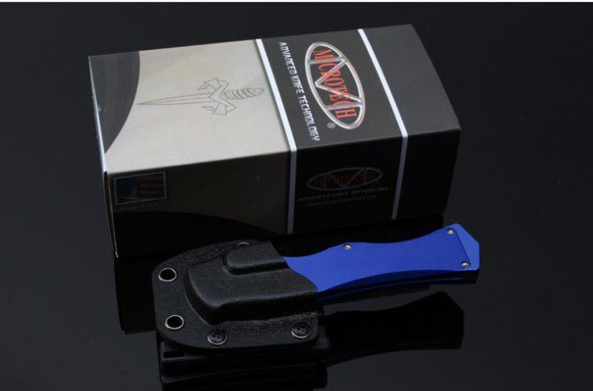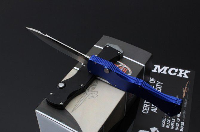 MICROTECH美国微技术光晕4弹簧刀 全长:23.5 CM 刃长:9.8 CM 刃宽:1.7 CM 刃厚:0.32 CM 刀刃材质:D2 柄材:铝合金 刀型:直跳 锁定类型:按钮锁 重量:188克(含包装) 附件:Kydex鞘,说明书,彩盒 整刀用CNC,电脑锣,线切割制作而成,手工,精密度非常高,绝对不会缩头,很值得收藏的一把刀