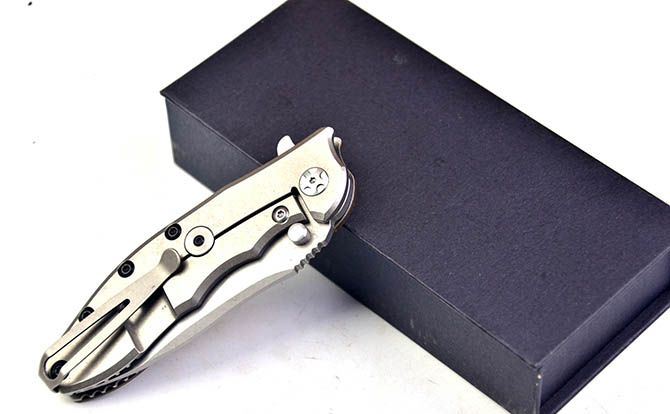 全 长:21.5cm 刃 长:9.0cm 柄 长:12.2cm 刃 宽:3.2cm(最宽处) 刃 厚:4.5mm 刃 材:D2高速钢 硬 度:60-62HRC 刀 柄:TC4钛合金(表面经石洗处理),加彩色G-10 表 面:灰钛 锁 式:侧锁 重 量:220克(含包装物) 备 注:钛合金背夹