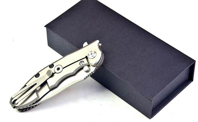 全 长:21.5cm 刃 长:9.0cm 柄 长:12.2cm 刃 宽:3.2cm(最宽处) 刃 厚:4.5mm 刃 材:D2高速钢 硬 度:60-62HRC 刀 柄:TC4钛合金(表面经石洗处理),加彩色G-10 表 面:灰钛 锁 式:侧锁 重 量:220克(含包装物) 备 注:钛合金背夹