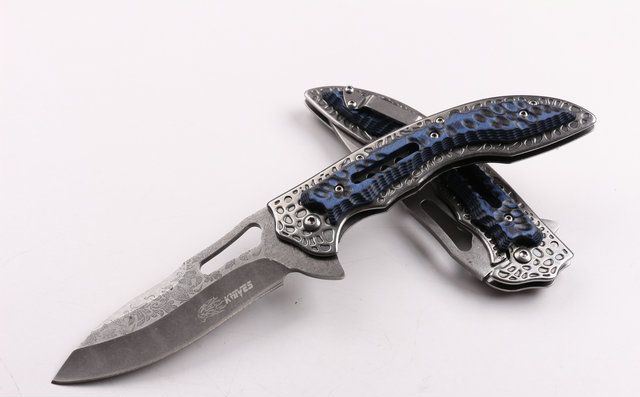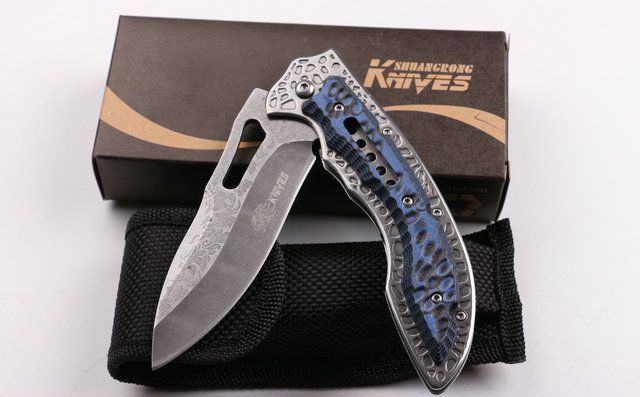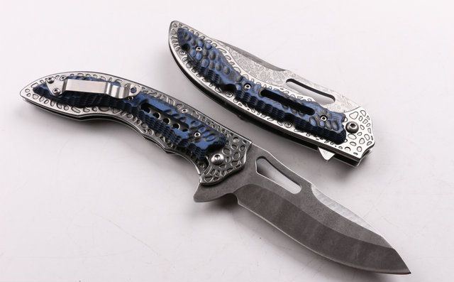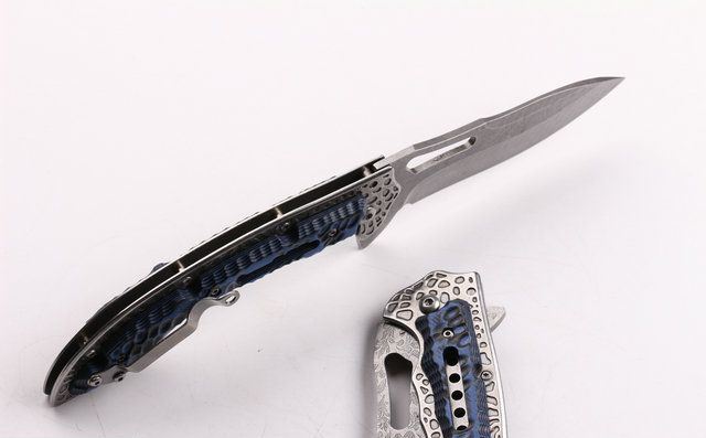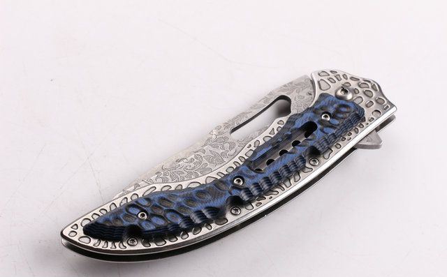 SR638D快开折刀 全 长:231mm 刃 长:100mm 柄 长:131mm 刃 宽:32mm 刃 厚:3.0mm 刃 材:5CR15MOV 重 量:200g(含包装) 硬 度:57HRC 表 面:腐蚀花纹 柄 材:扎纹钢+G10 锁 型:线锁 其 他:配厂盒+优质尼龙套