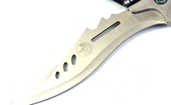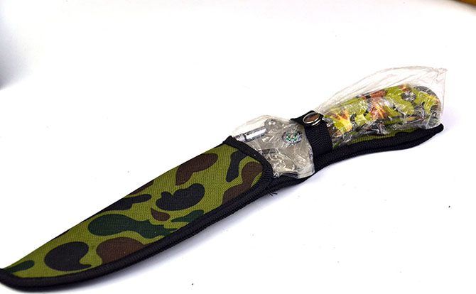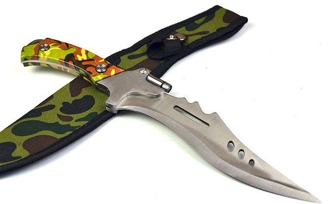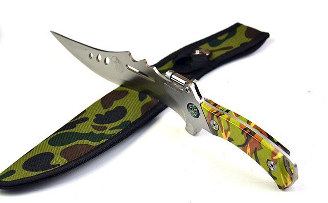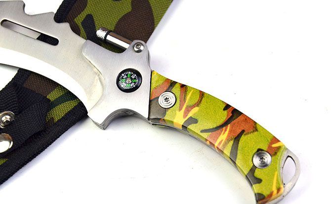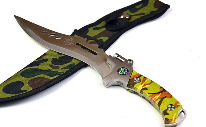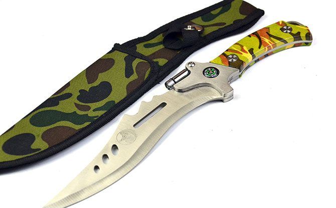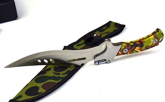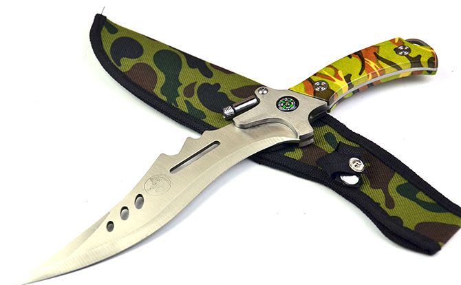 狼头猎刀 全 长:323mm 刃 长:200mm 柄 长:118mm 刃 宽:42mm 刃 厚:3.0mm 刃 材:3Cr15Mov 重 量:300g(含包装) 硬 度:56HRC 表 面:砂光 柄 材:彩木(披履) 其 他:配尼龙套(带灯)