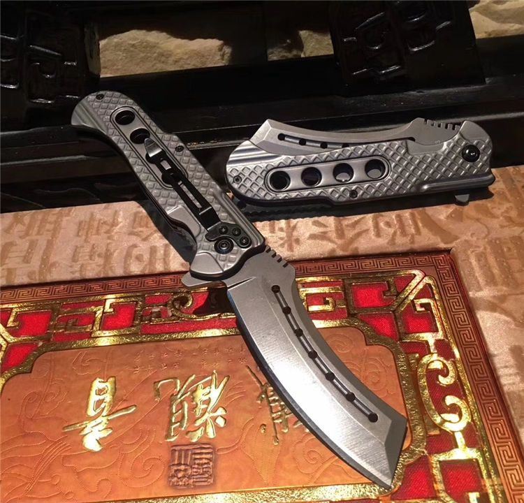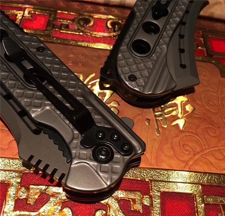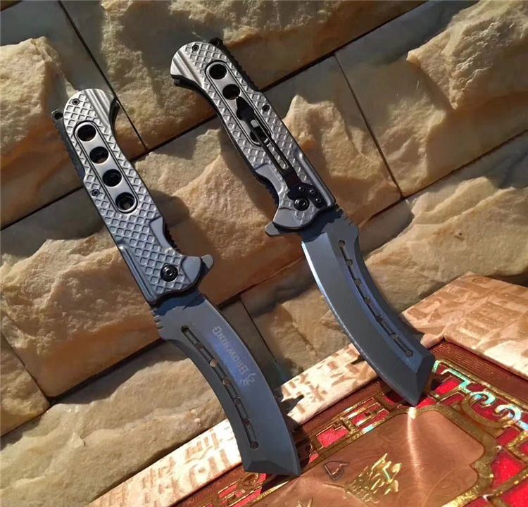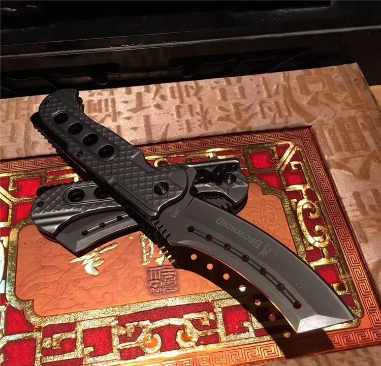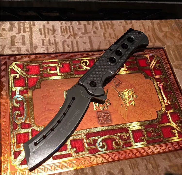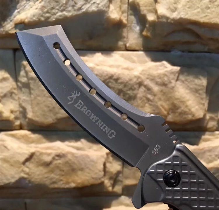 勃朗宁363快开折刀 全 长:228mm 刃 长:95mm 柄 长:123mm 刃 宽:28mm 刃 厚:3.5mm 刃 材:5Cr15Mov 重 量:263g(含包装) 硬 度:57HRC 表 面:镀钛 柄 材:钢柄 锁 型:快开 其 他:配彩盒