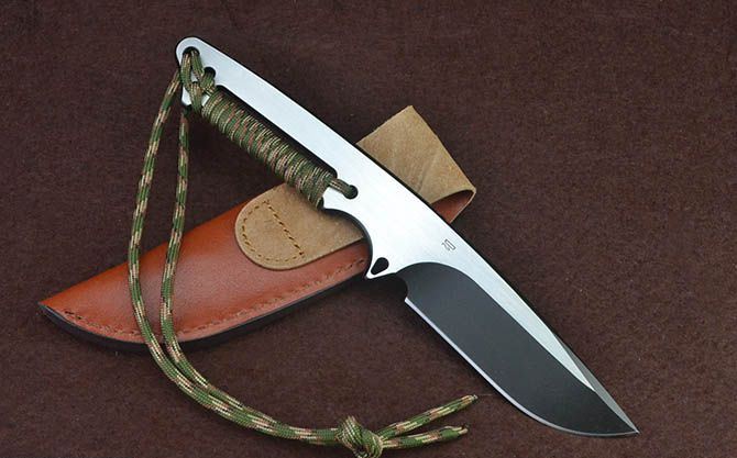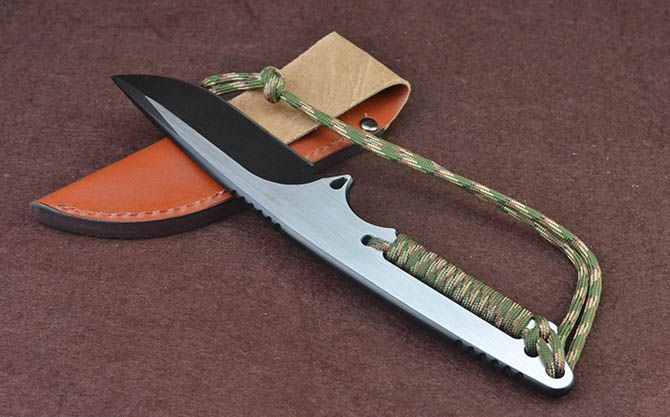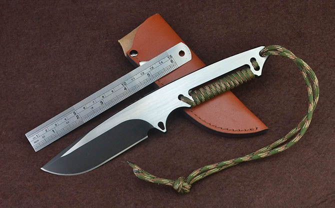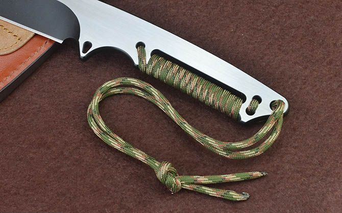 全长:23.2cm 刃长:10cm 柄长:12cm 刃厚:5.8mm 刃宽: 3.5cm 刃材: D2 表面:黑钛+拉丝 柄材: 一体+绑绳 硬度: 60HRC 毛重:399克(含包装) 包装:高档纸盒、皮套