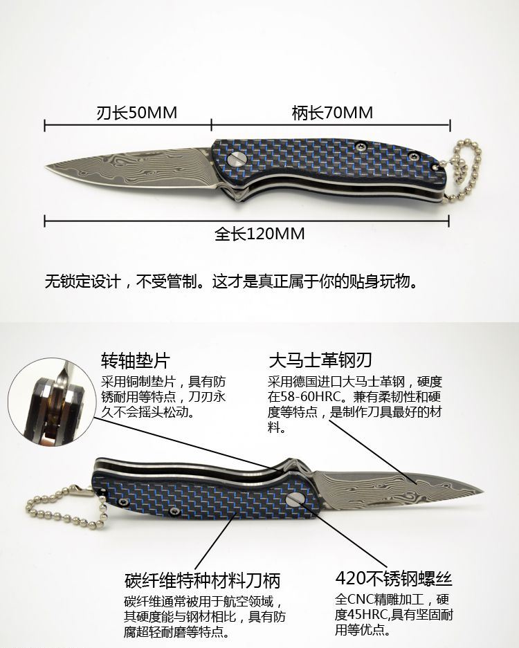 总 长:122mm 刃 长:52mm 柄 长:70mm 刃 厚:2.4mm 刃 材:进口大马士革 柄 材:碳纤维 硬 度:58-59HRC 锁 定:无锁 重 量:100克(含包装) 包 装:原厂礼品盒