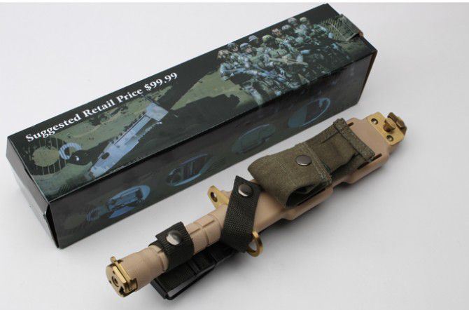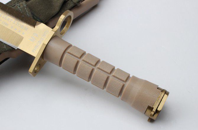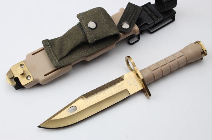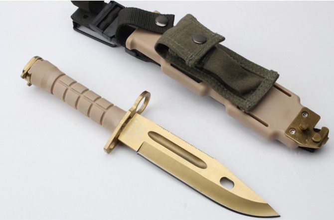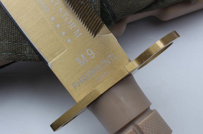 黄金M9军刺可拆卸 全长:32.5CM 刃长:20CM 柄长:12.3CM 身最大宽度:3.8CM 刀厚:0.58CM 毛重:820克(含刀鞘) 刃材:7Cr17Mo军用不锈钢 (这个不是一般的钢是军用钢材质)