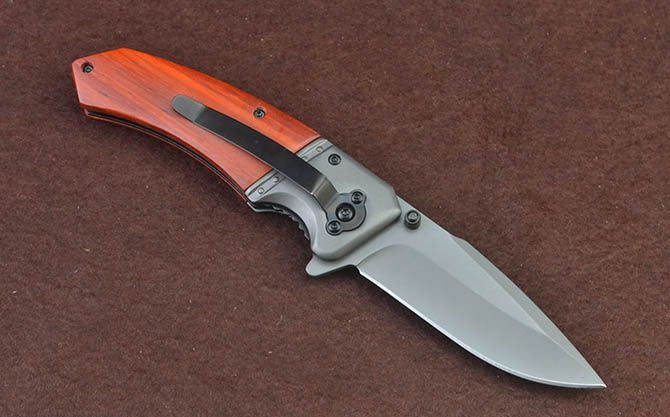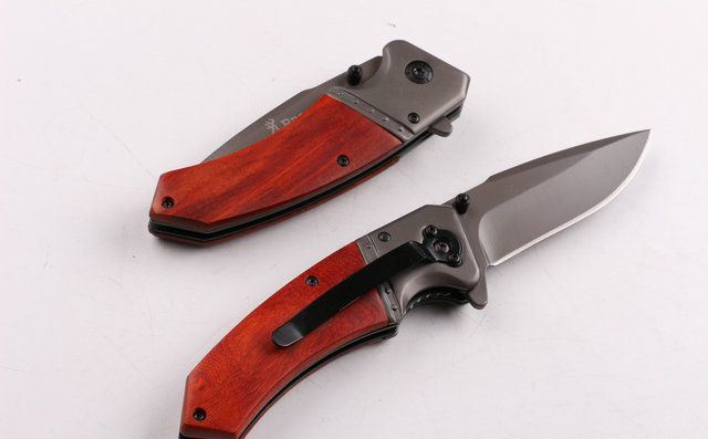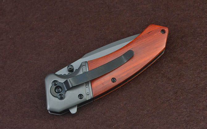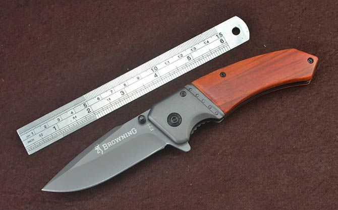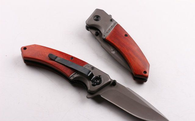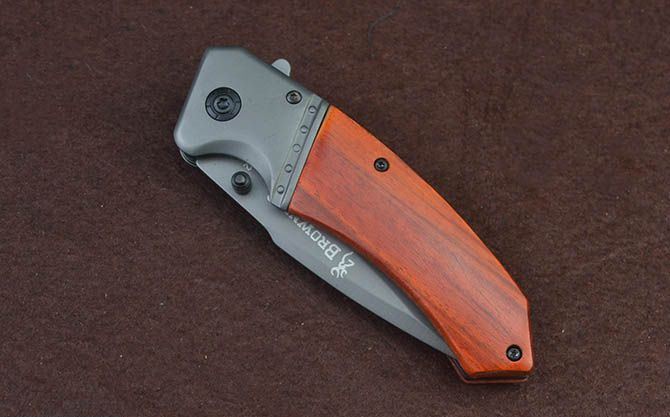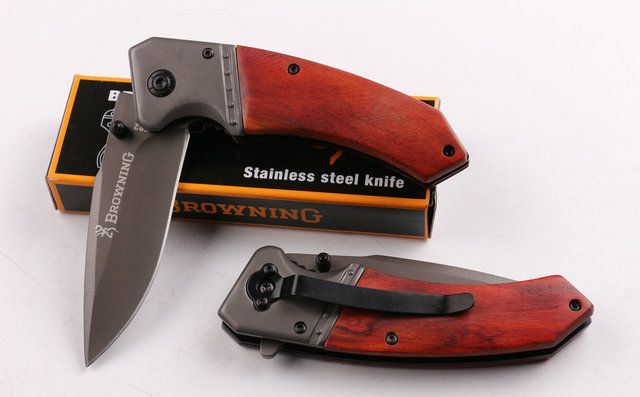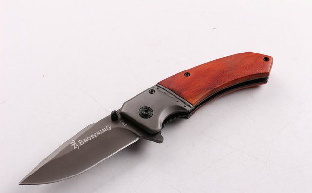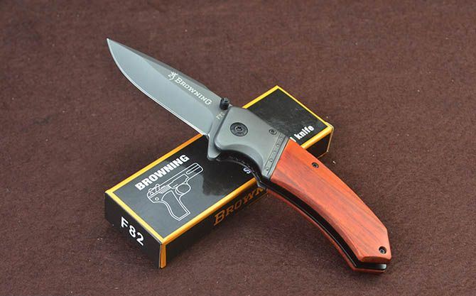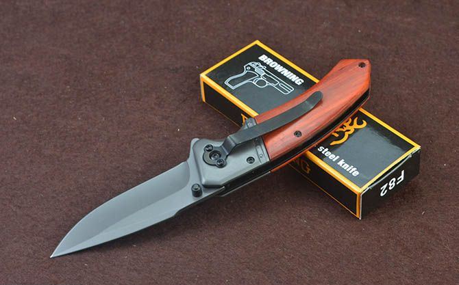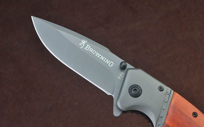 勃朗宁F82快开折刀 全 长:196mm 刃 长:81mm 柄 长:116mm 刃 宽:28mm 刃 厚:3.2mm 刃 材:440 重 量:150g(含包装) 硬 度:57HRC 表 面:镀钛 柄 材:钢片+实木 锁 型:线锁 其 他:配厂盒
