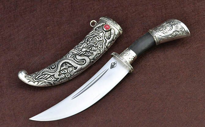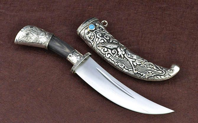 藏刀不仅是实用性很强的用具,同时还具有很高的艺术欣赏价值。现如今,藏刀就成为非常紧俏的旅游商品和馈赠礼品,深受人们的喜爱。藏刀的刀身是以钢材锻制而成,通过手工精心加工,使刀刃锋利,刀面净光。藏刀从规格尺寸上大致可分为长刀、短刀和小刀三种。长刀最长的有一米多,短刀约40厘米左右,小刀则仅有十几厘米长。其短刀具有火镰和吸铁敛钢功能,长刀则可当作篷杆、扁担、拐棍和放血疗法刺器等使用;从形状上讲,具有很强的地方特色,有牧区式、康巴式、后藏式等区别;用途上分,也有很多种,如林区砍树有专门的砍树刀、屠宰刀,甚至天葬场上用的也有专制刀具。藏刀的刀把多用以牛角,牛骨或木材制成,较高档的刀把用银丝、铜丝等缠绕,刀鞘则更为讲究,除较简单的只有木鞘或皮套外,多数是包黄铜、白铜,甚至包白银,并且上面刻有各种精美的飞禽走兽及花草等图案,有的还镶嵌各种宝石、镀金等,显得格外华丽和富有。