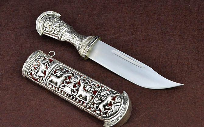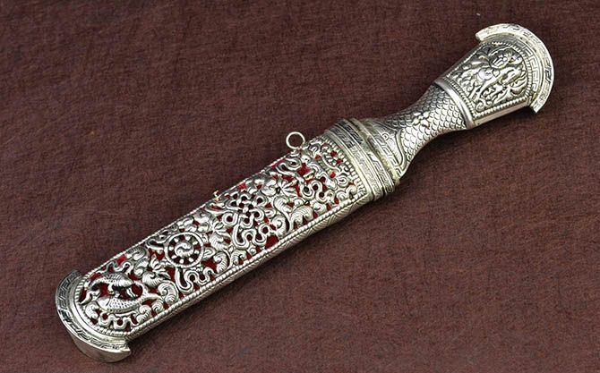 鞘材:采用藏银纯手工制做,内装木芯以保护刀刃。