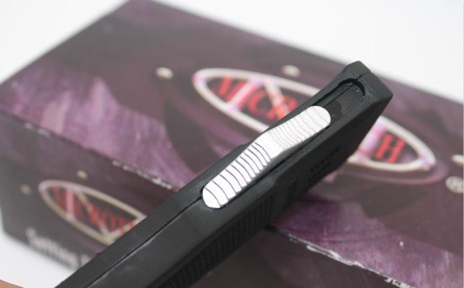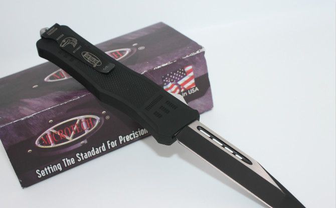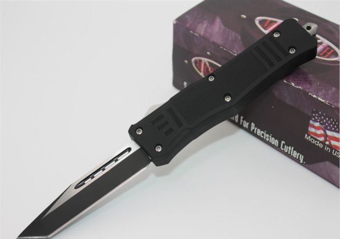微技术方头伤齿龙A161(单锋全刃) 全 长: 23.5cm (含尾锥长度) 刃 长: 9.5cm 刃 厚: 2mm 刃 材: 440 硬 度: 58HRC 刀净重:258克 总重量: 400克(含包装物) 表 面: 黑钛(刀刃) 柄 材: 锌铝合金 刀 鞘: 尼龙 锁 闭: 弹簧直出 补充说明:直出弹簧刀的点头现象得到了很好的控制,出刀轻而快!手感好!