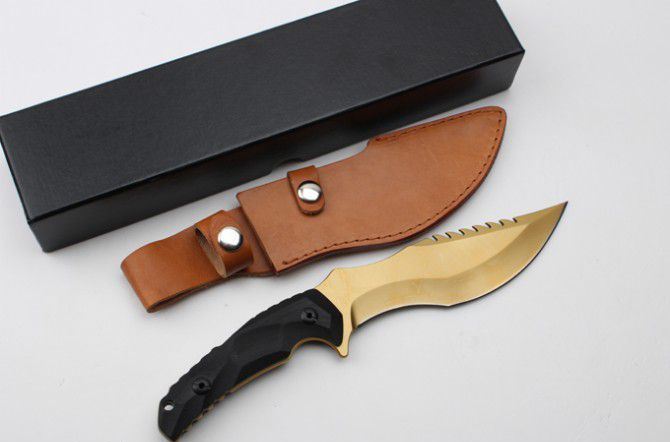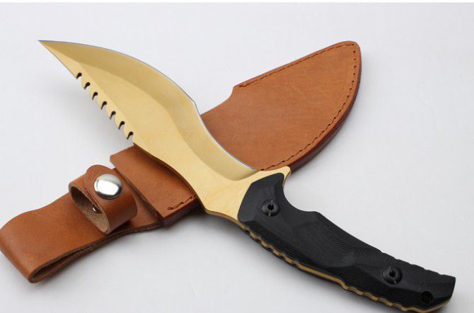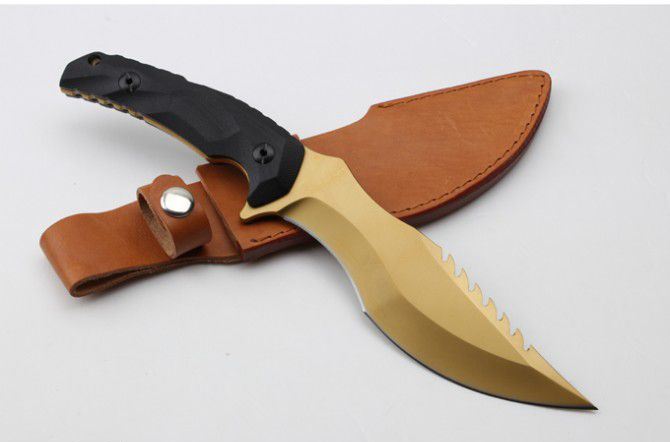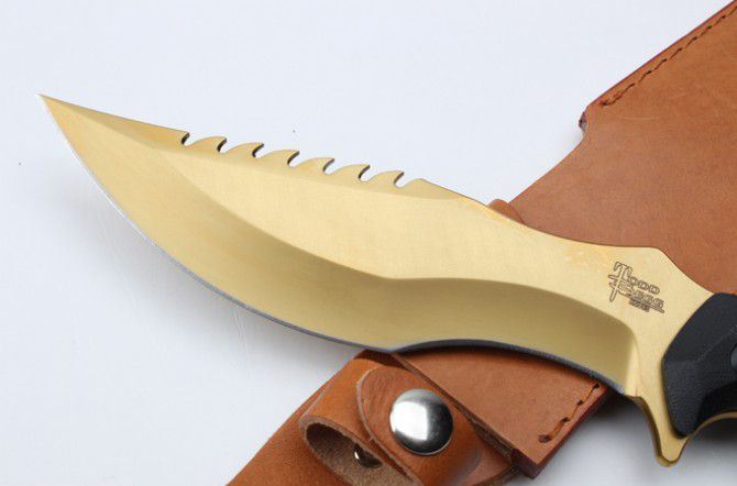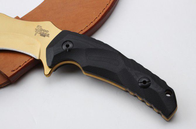 托德贝格终极斗士(黄金版) 全 长:290mm 刃 长:170mm 柄 长:123mm 刃最宽:46mm 刃 厚:5.5mm 刃 材:9cr18mov 重 量:595g(含包装) 硬 度:59HRC 表 面:镀钛 柄 材:钢一体柄+G10 锁 型:定锁 其 他:配牛皮套+牛皮纸盒子