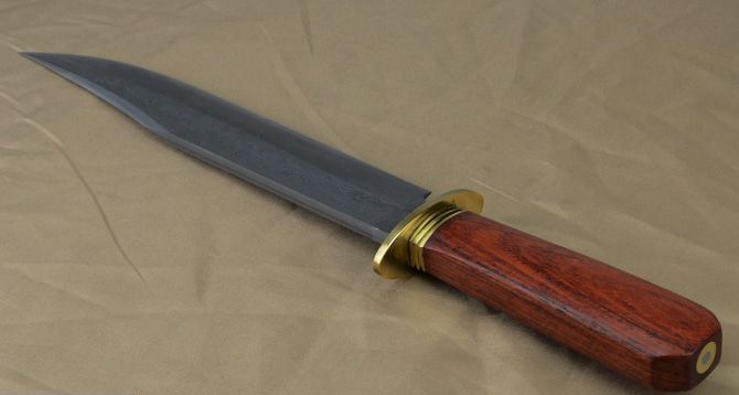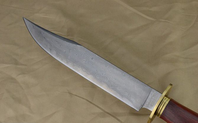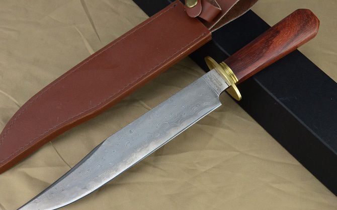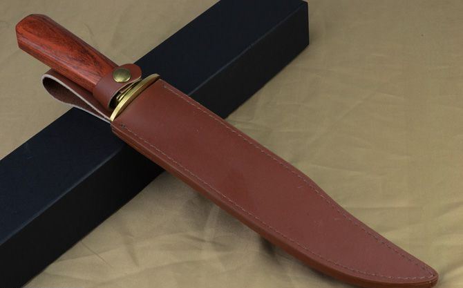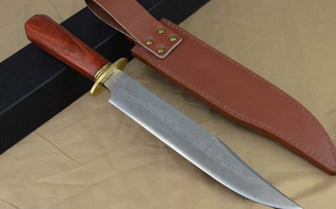 冷钢16cc花纹钢博伊刀 全长:39.5cm 柄长:13cm 刃长:26.2cm 刀厚:6.3mm 刃宽:4cm 刃材:花纹钢 柄材:酸枝木 护挡:纯黄铜 硬度:59HRC 净重:428克 毛重:770克(含皮鞘、包装)