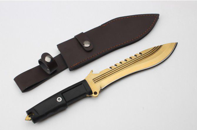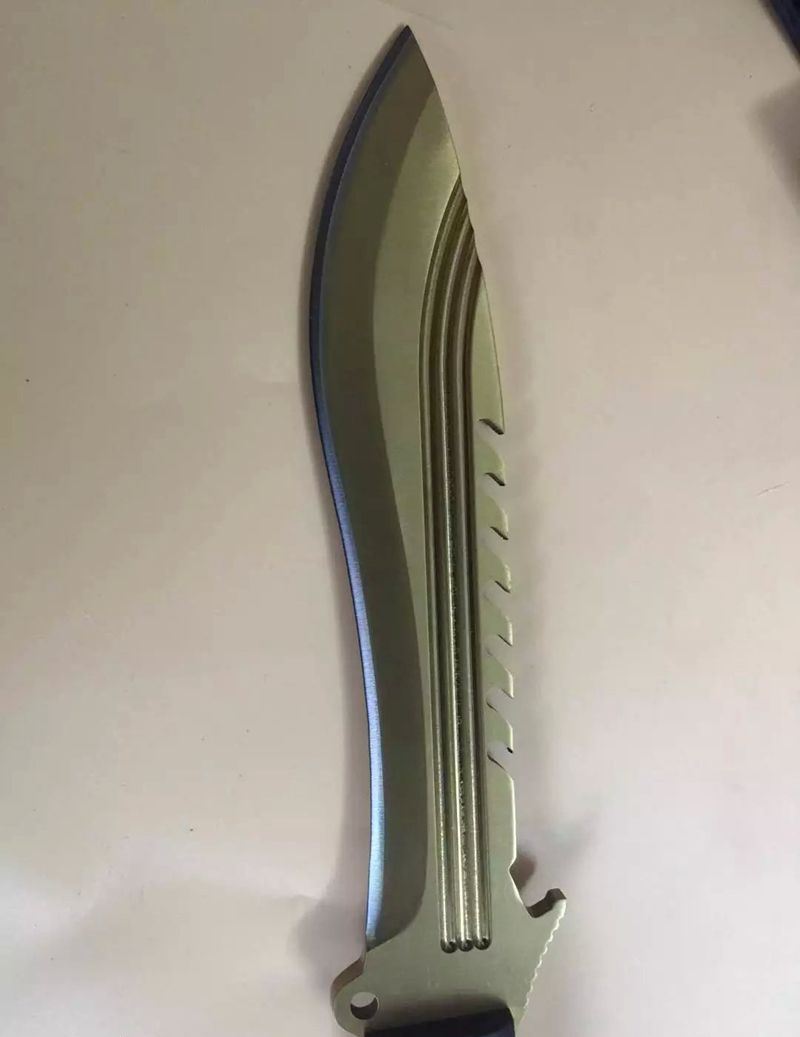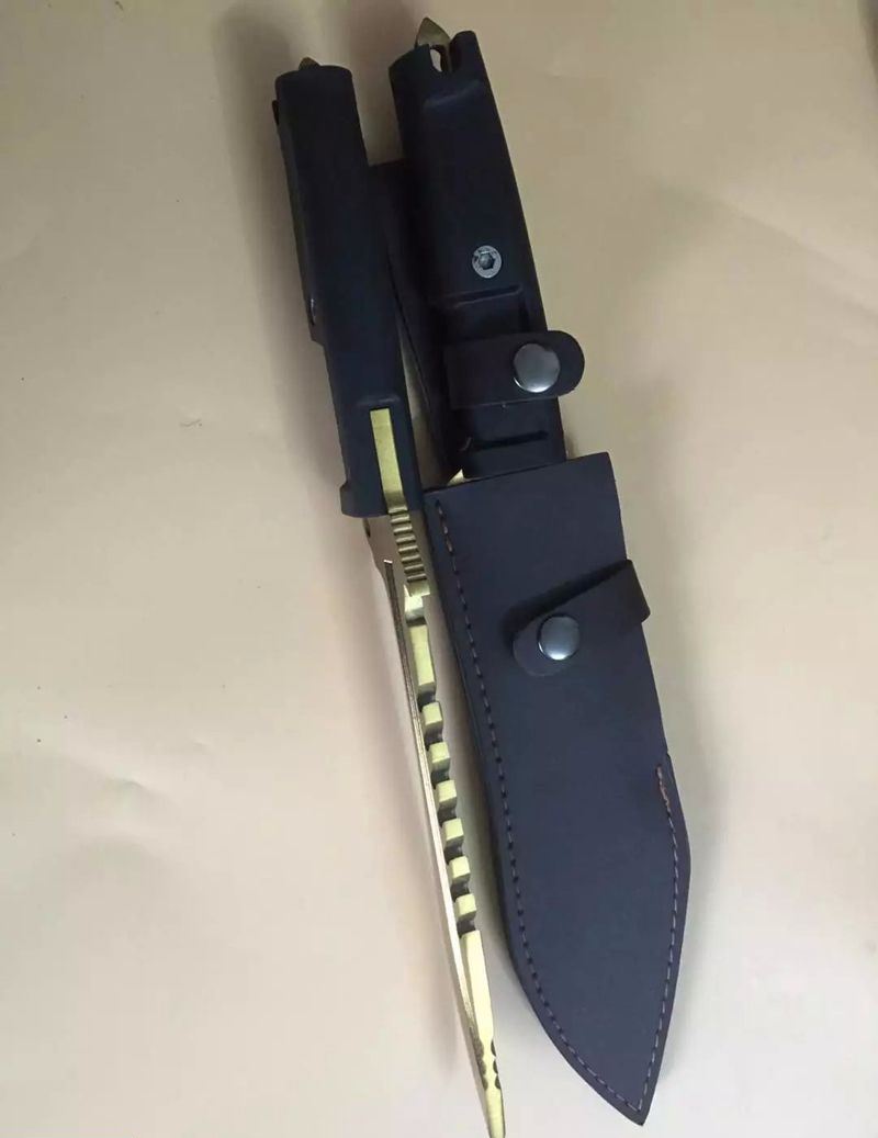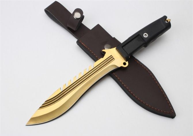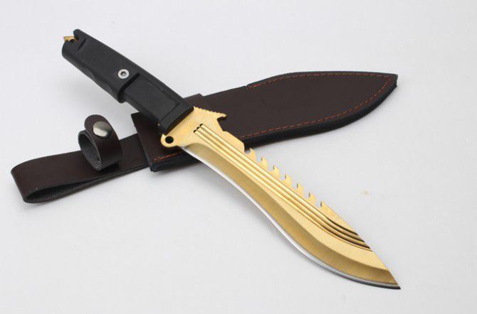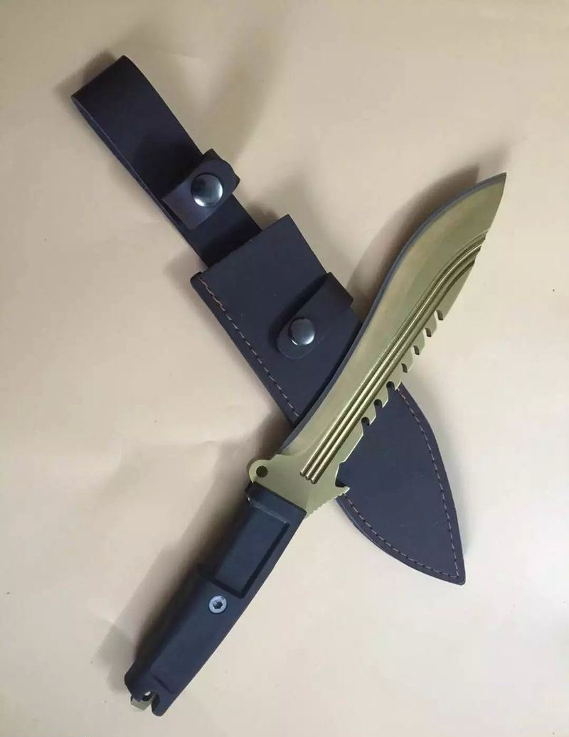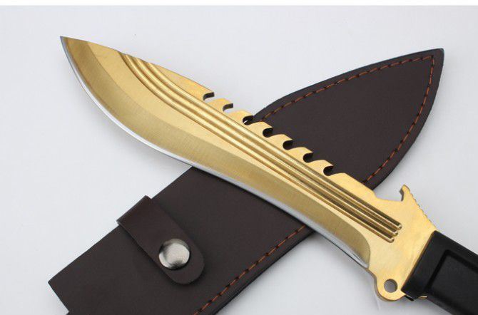 全 长:350mm 刃 长:22m 柄 长:136m 刃 宽:40 刃 厚:6mm 刃 材:7Cr17Mov 重 量:485克 硬 度:58HRC 表 面:镀金色 柄 材:龙骨结构+橡胶