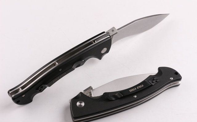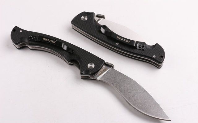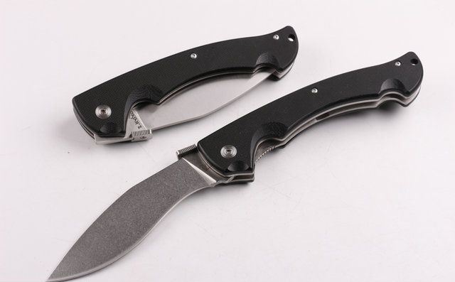 冷钢COLD大狗腿折刀(石洗) 全长:27.2cm 刃长:12cm 柄长:15.cm 刃厚:0.36cm 刃宽: 3.2cm 刃材: 5CR15MOV 柄材: 黑色G10 硬度: 56HRC 净重;250克 锁定;线锁 表面处:石洗 其他:原厂彩合,送尼龙刀套
