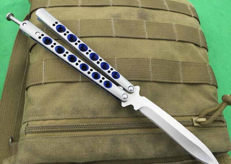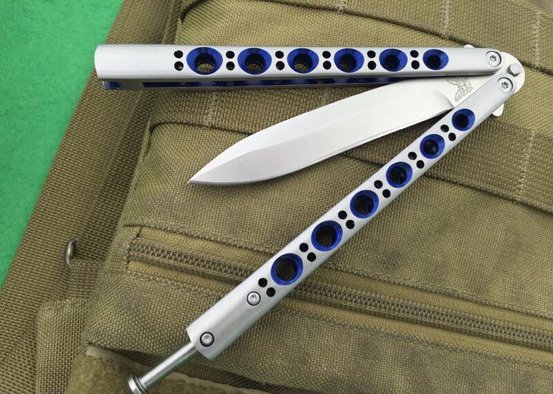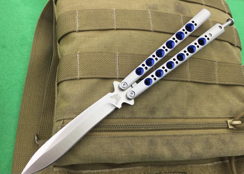全长:24CM(打开) 刃长:9.5CM 刃厚:0.3CM 刃材料:440C 硬度:59-60 重量:150克 刀鞘:高级尼龙刀鞘 铸钢柄镂空,压弹出刀 The one蓝孔BM41甩刀,蝴蝶经典款式之一,一体柄型,刀刃选用高级440C钢,螺丝扣锁都经过严格调配,刃口锋利,缎光表面,秉承The one优良血统