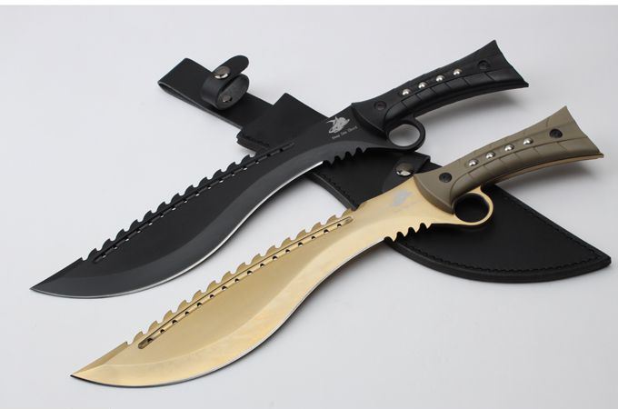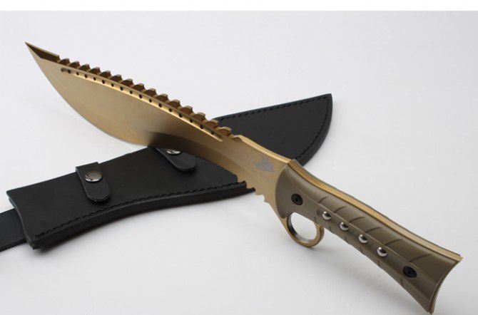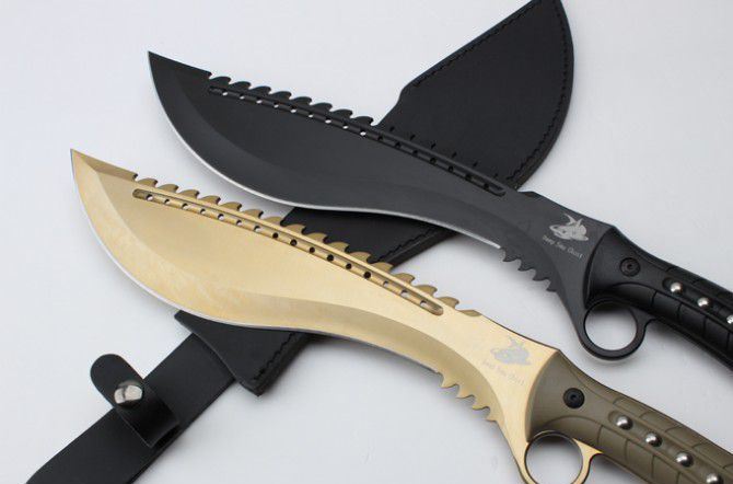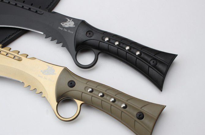 海底幽灵战龙(黑钛、金色) 全 长:44.8mm 刃 长:299mm 柄 长:147mm 刃 宽:6.8mm 刃 厚:4.1mm 刃 材:7Cr17Mov 重 量:967g(含包装) 硬 度:57HRC 表 面:黑钛-金色 柄 材:ABS 锁 型:定锁 其 他:配尼套和硬纸盒