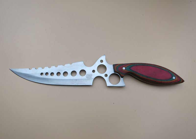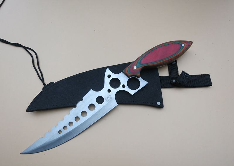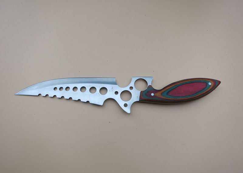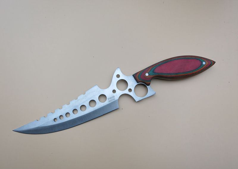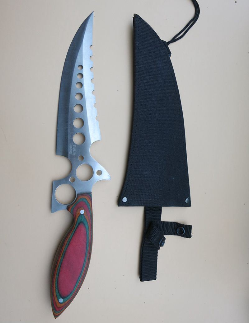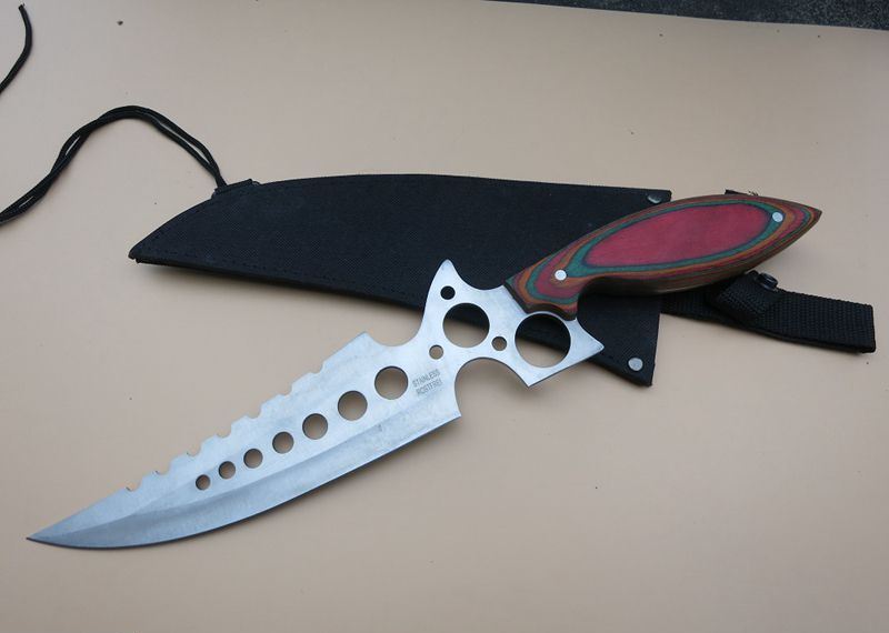暴龙连环七眼直刀 全 长:40Cm 刃 长:20Cm 柄 长:16Cm 刃 宽:7.2Cm(最宽处) 刃 厚:3mm 刃 材:4CR13Mov 重 量:500克毛重 硬 度:57HRC 表 面:砂光 柄 材:彩木柄 锁 型:定锁 其 他:尼龙套+纸盒