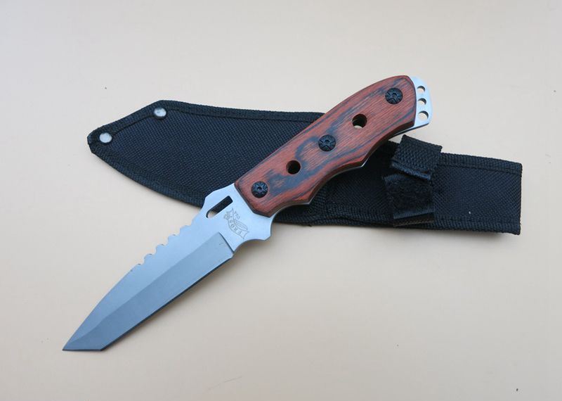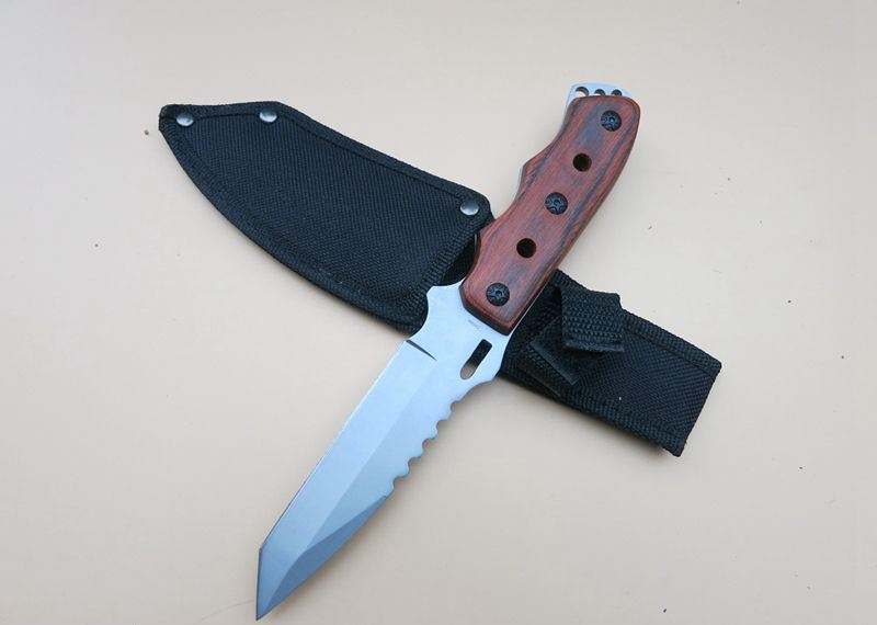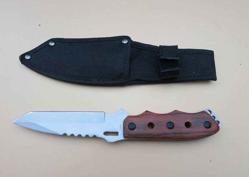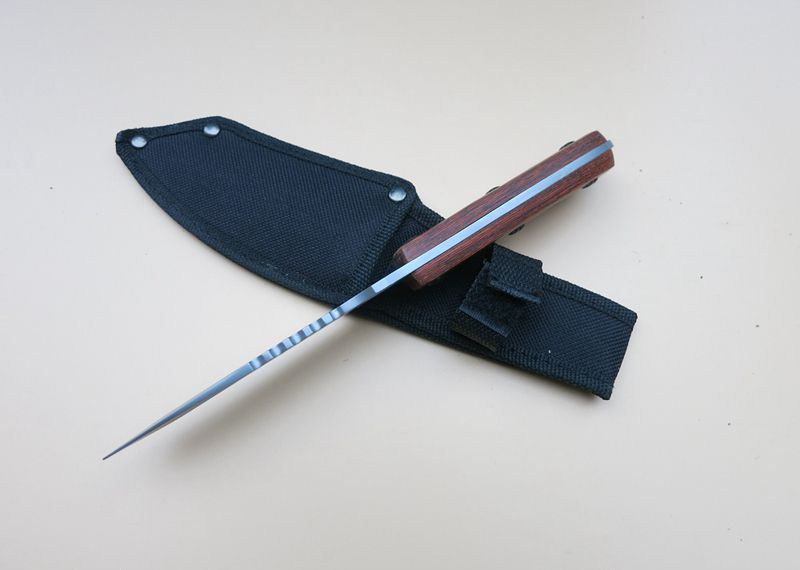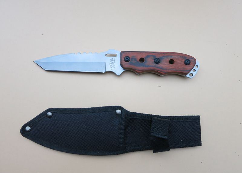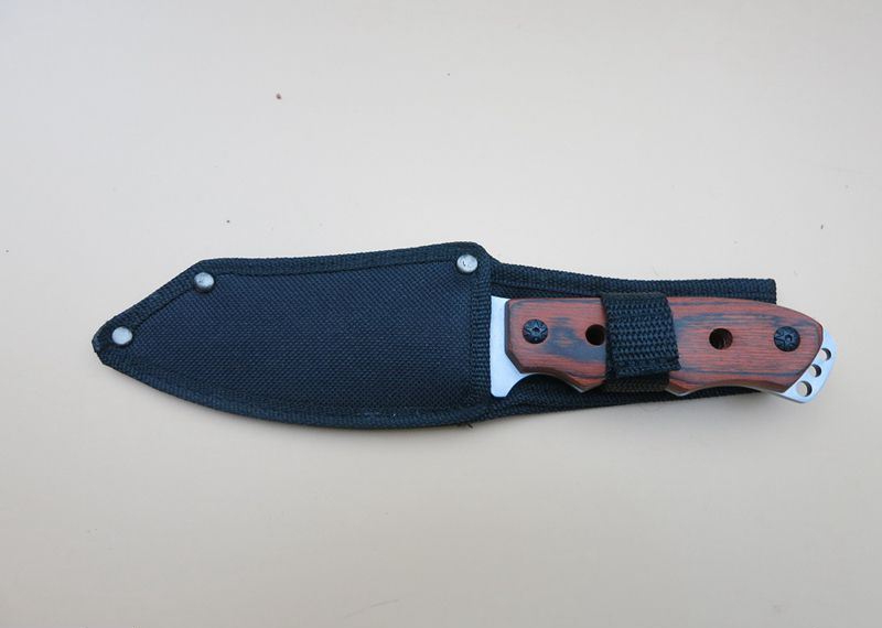瓦尔特木柄小直刀 全 长:22.5Cm 刃 长:10Cm 柄 长:10.5Cm 刃 宽:2.6Cm(最宽处) 刃 厚:3mm 刃 材:4CR13Mov 重 量:200克 硬 度:57HRC 表 面:砂光 柄 材:彩木柄 锁 型:定锁 其 他:尼龙套