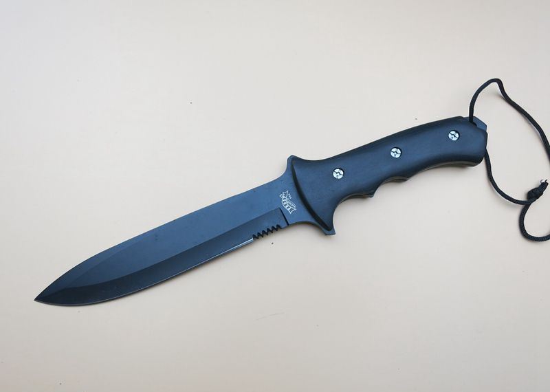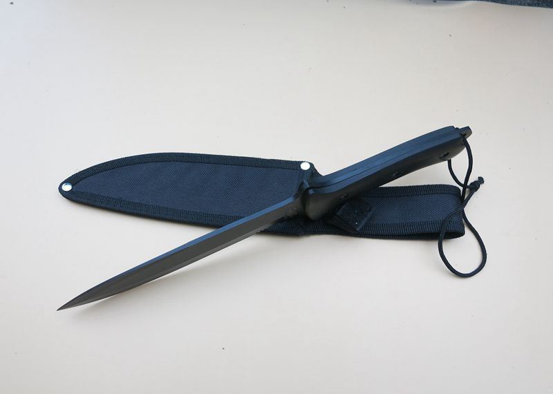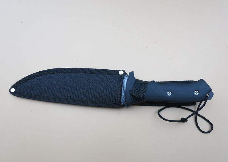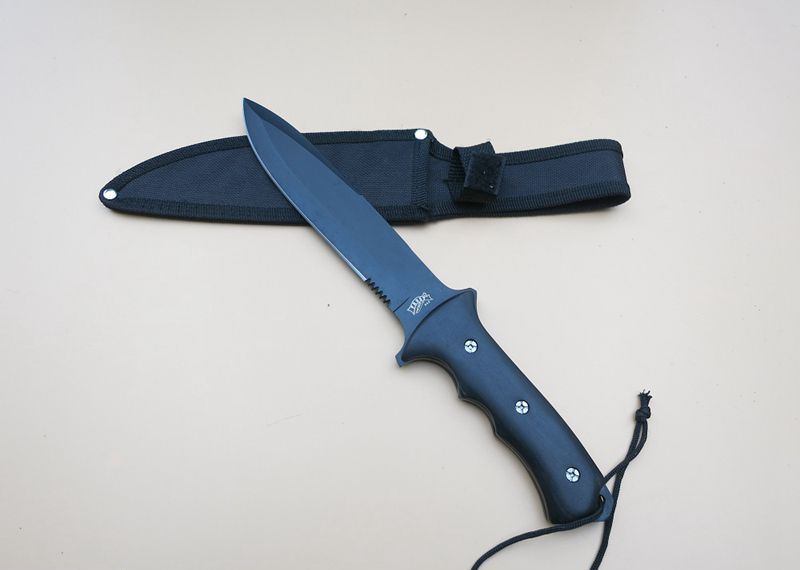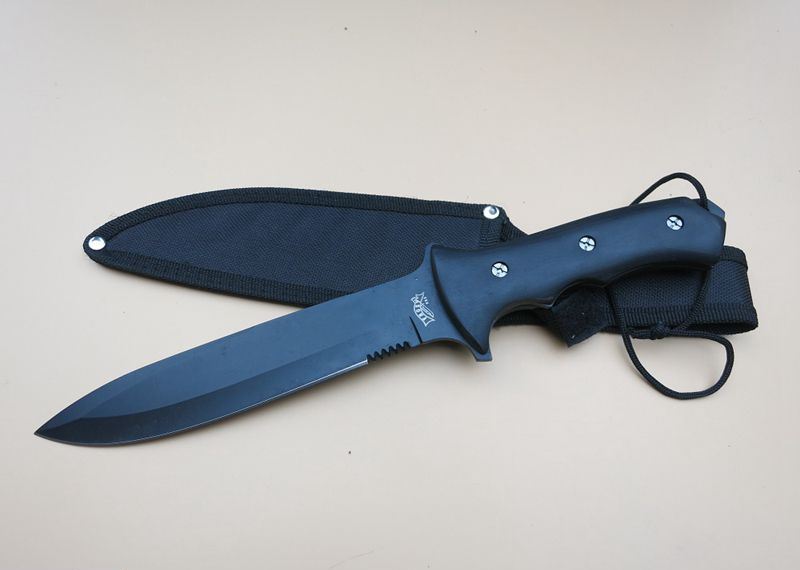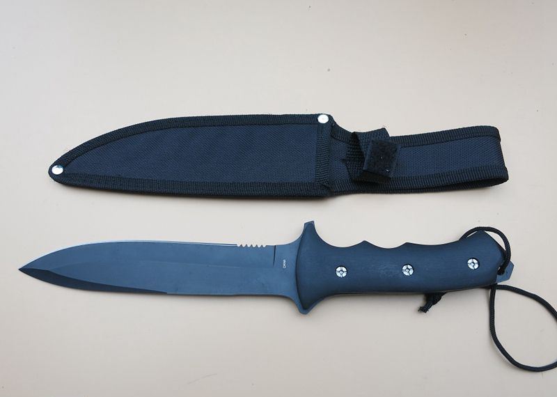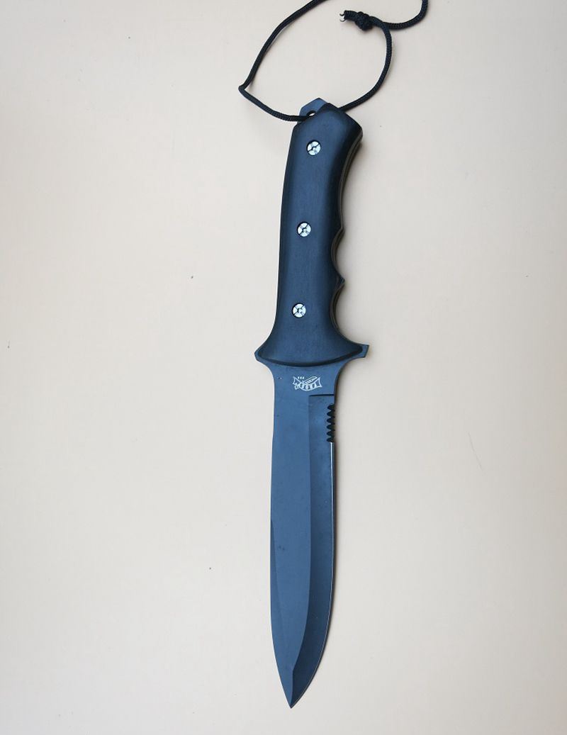 黑骑士匕首 全 长:31.5Cm 刃 长:17Cm 柄 长:13Cm 刃 宽:3.3Cm(最宽处) 刃 厚:3mm 刃 材:4CR13Mov 重 量:320克 硬 度:57HRC 表 面:高温喷漆 柄 材:黒木柄 锁 型:定锁 其 他:尼龙套