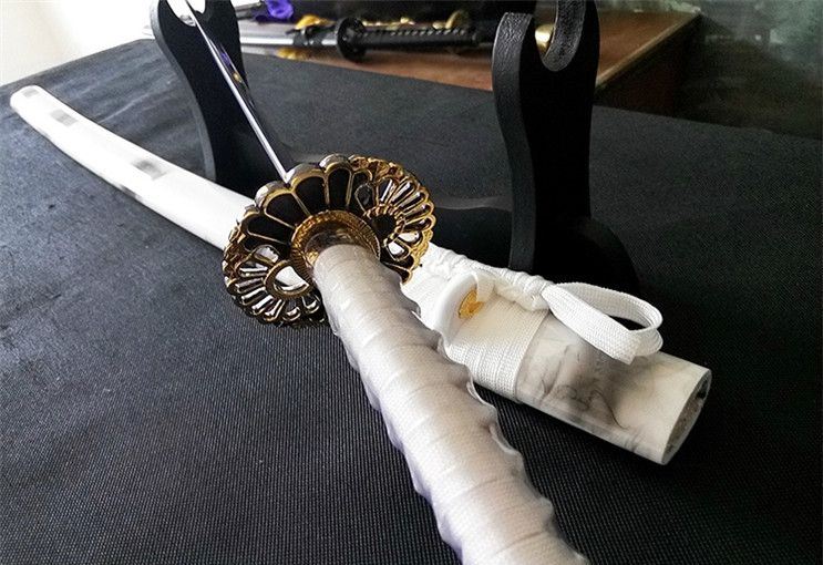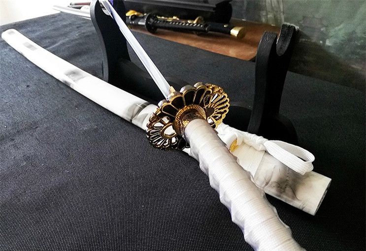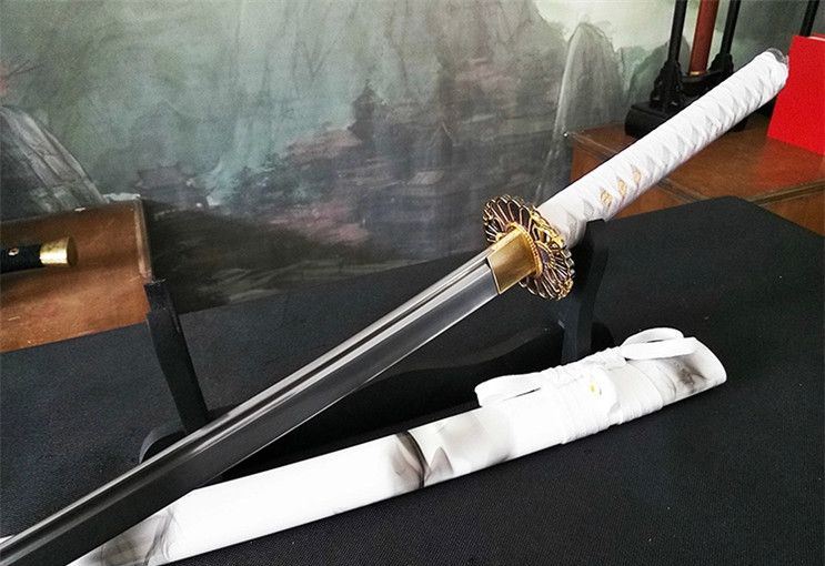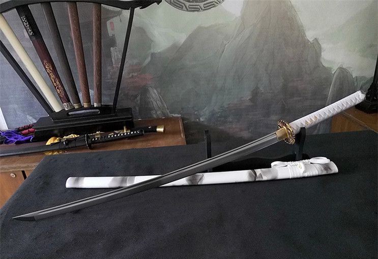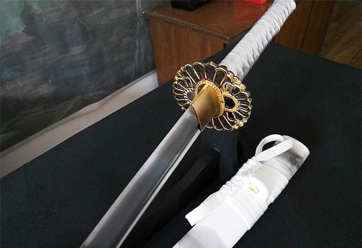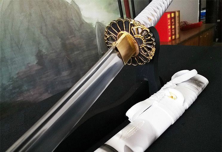 大典太光世锰钢阳花武士刀 全长:102cm 柄长:26cm 刃长:72cm 刃宽:3.2cm 刃厚:0.7cm 材质:高锰钢 柄材:原木 硬度:60 重量:1400g 包装:高档锦盒