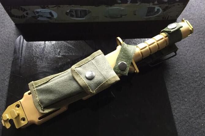 全 长:32cm 刃 长:19.8cm 刃 厚:5.9mm 刃 材:5CR13 硬 度:56HRC 重 量:刀410g+鞘400g 表 面:镀金 柄 材:ABS 刀 鞘:ABS