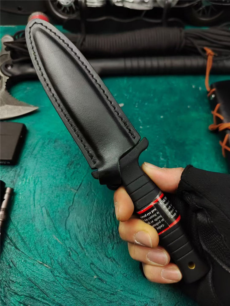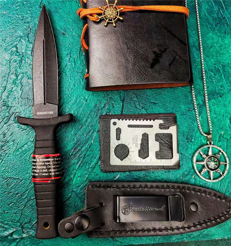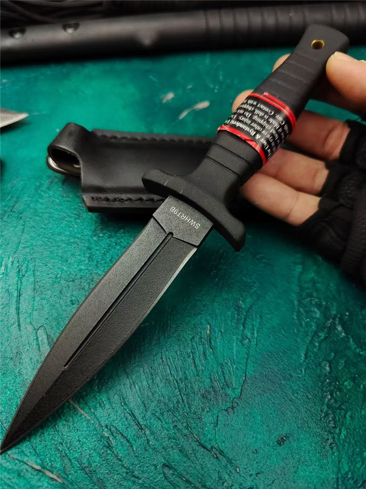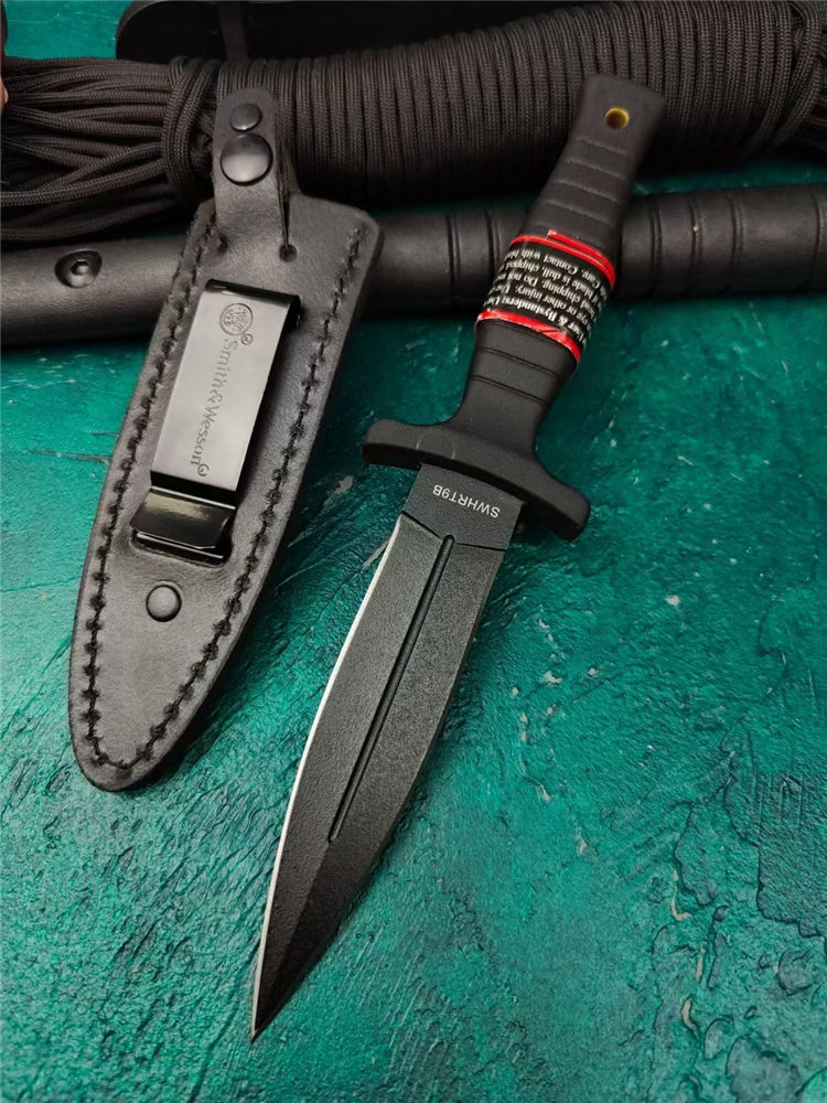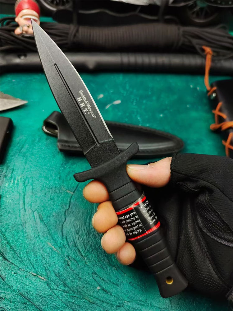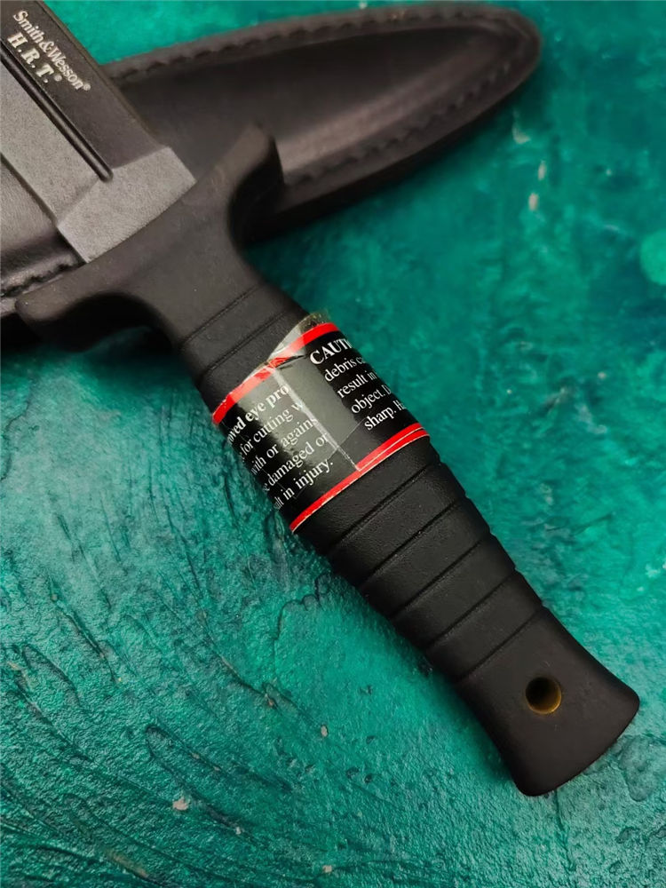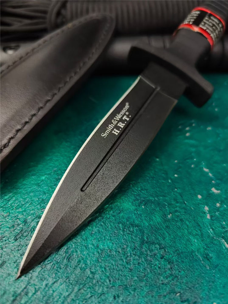 史密斯.威森HRT9B双刃刺 全长:23cm 刃长:11cm 柄长:10.3cm 刃厚:4mm 刃宽:2.5cm 刃材:440 柄材:G10 硬度:56Hrc 重量:210克 表面:黑色 刀套:皮革