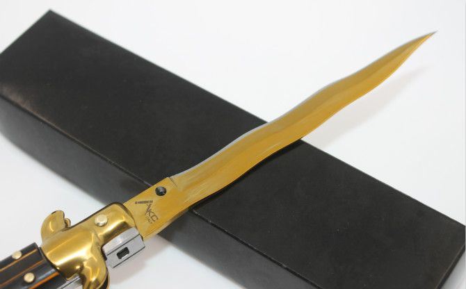 意大利黑手党使用的经典刀具-赌徒跳刀,在电影"教父"里出尽了风头!11英寸(28CM)天然黑牛角柄的黑手党侧跳,出刀迅速,锁定稳固,具有超强的穿刺力!带有保险装置,刀护手处暗藏闭合开关,,AKC公司出口产品,功能性完工度不错,满足把玩和收藏的需要