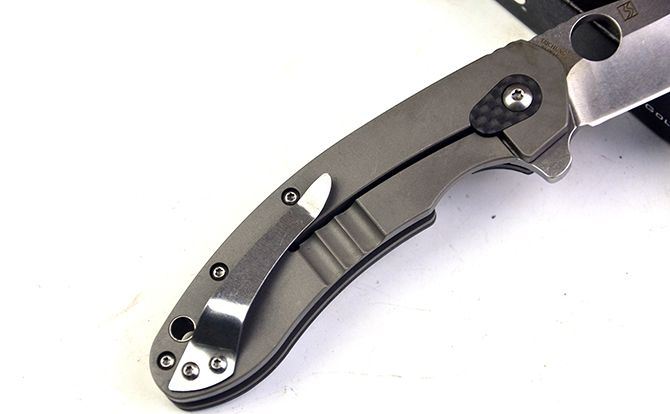 蜘蛛C156钛合金折刀(碳纤版) 全 长:202mm 刃 长:92mm 柄 长:116mm 刃 宽:24mm 刃 厚:3.8mm 刃 材:CTS-204P(进口钢材) 重 量:160g(含包装) 硬 度:58HRC 表 面:石洗纹 柄 材:钛合金+碳纤 锁 型:线锁 其 他:配彩盒和出世纸