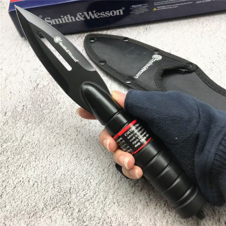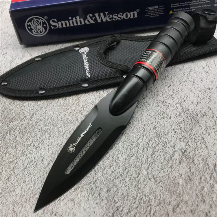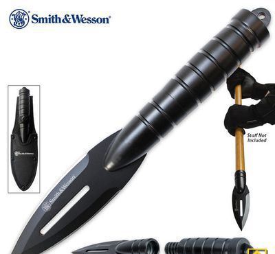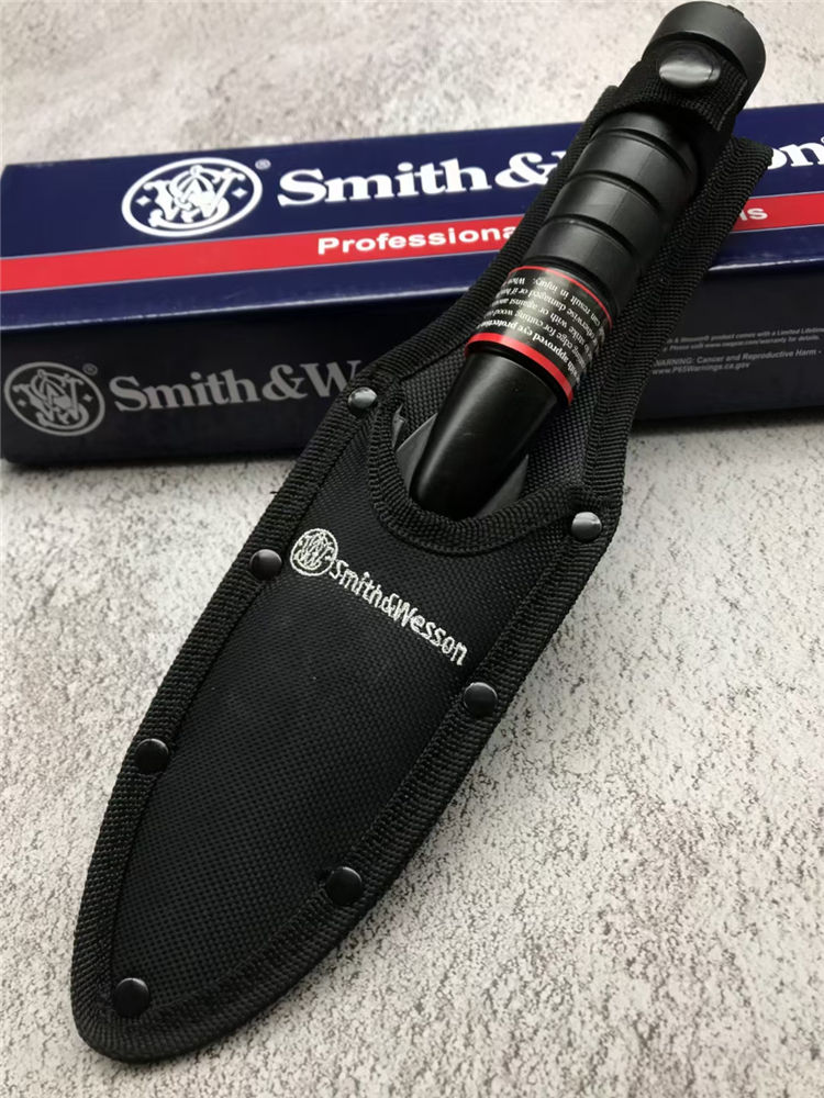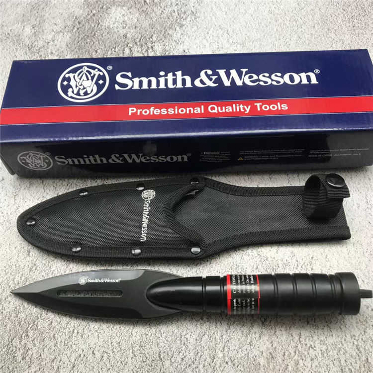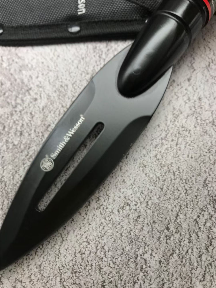 史密斯.威森SW8野战矛 全长:27.5cm 刃长:11.4cm 柄长:12.5cm 刃厚:4mm 刃宽:3.8cm 刃材:440 柄材:G10 硬度:56Hrc 重量:375克 表面:黑色 刀套:尼龙套