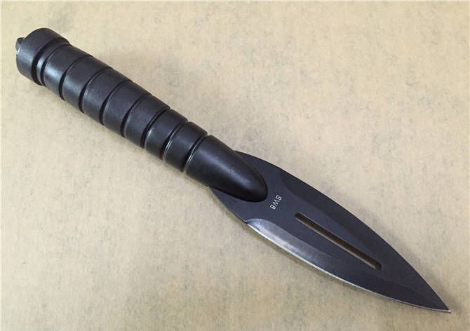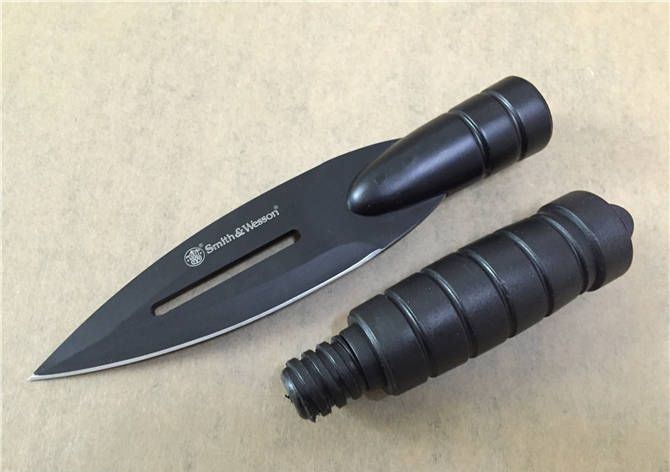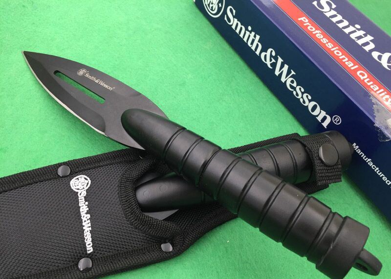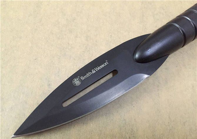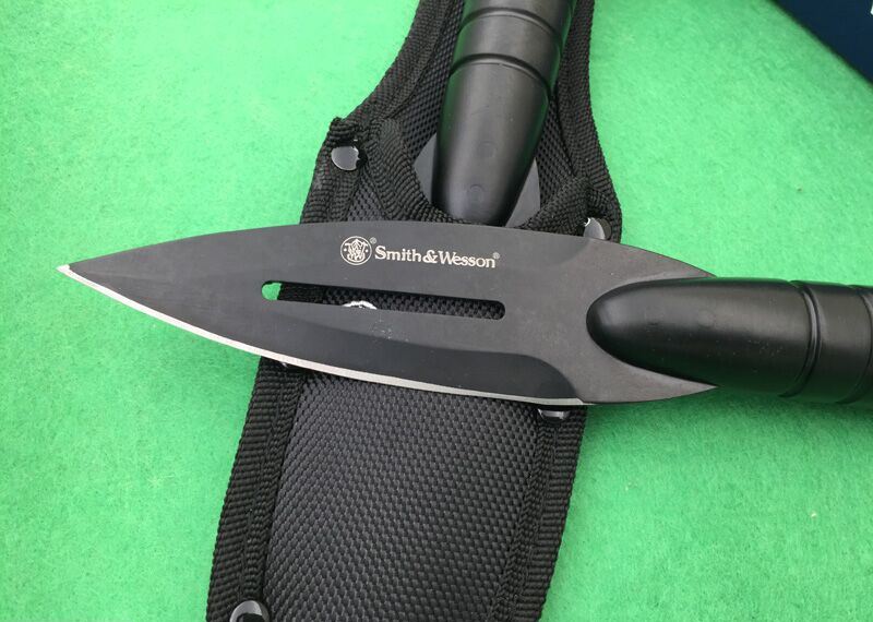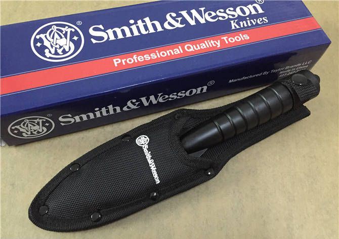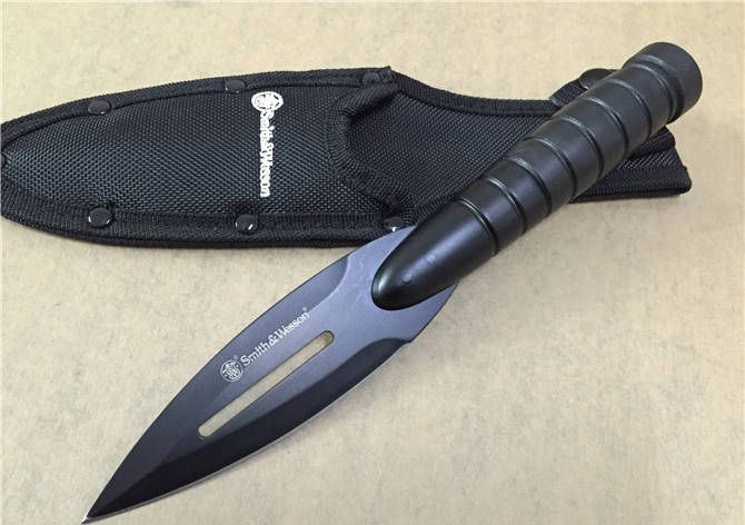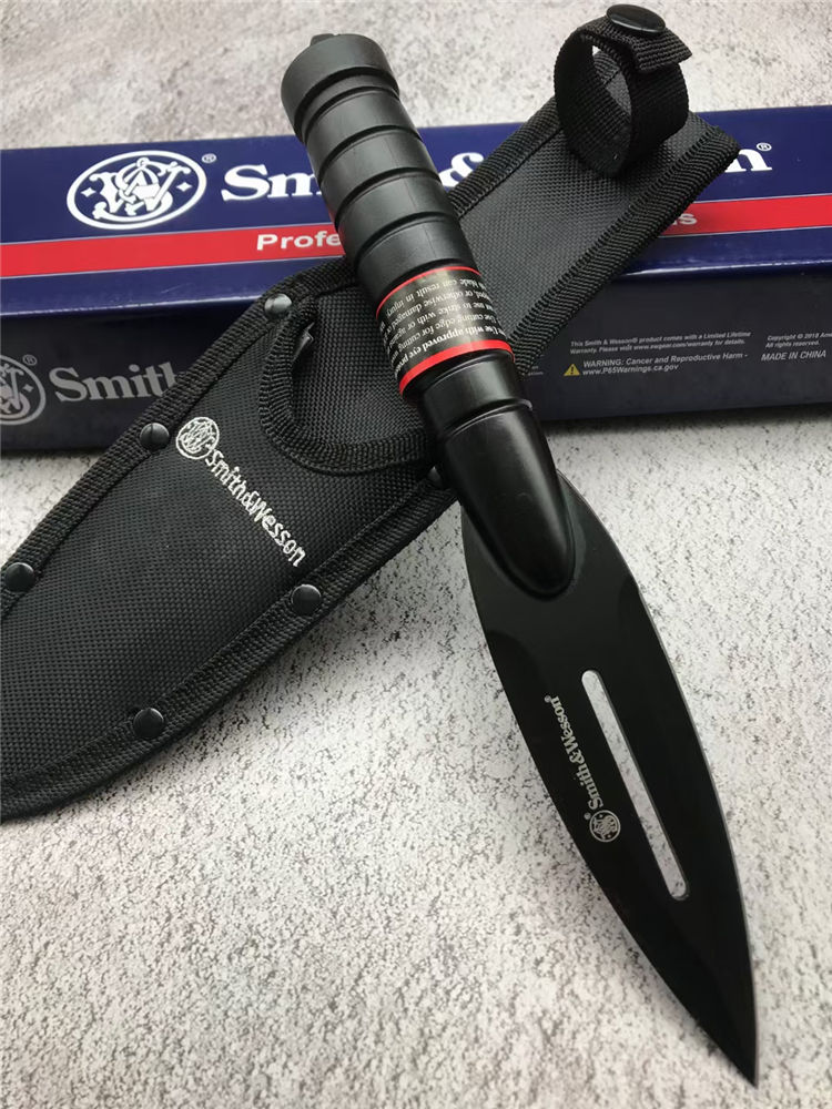 史密斯.威森SW8野战矛 全长:27.5cm 刃长:11.4cm 柄长:12.5cm 刃厚:4mm 刃宽:3.8cm 刃材:440 柄材:G10 硬度:56Hrc 重量:375克 表面:黑色 刀套:尼龙套