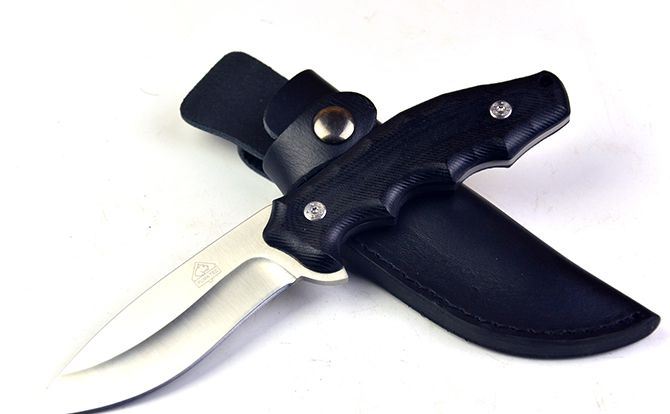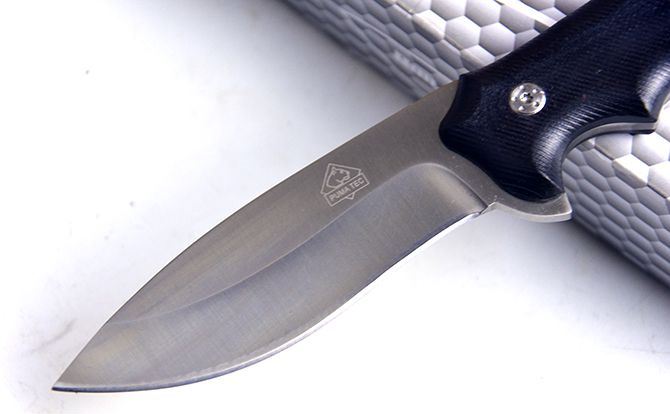 彪马PUMATEC小直刀 全 长:220mm 刃 长:100mm 柄 长:120mm 刃 宽:32mm 刃 厚:4.5mm 刃 材:9Cr18Mov 重 量:253g(含包装) 硬 度:59HRC 表 面:砂光 柄 材:黑G10 锁 型:定锁 其 他:配牛皮套