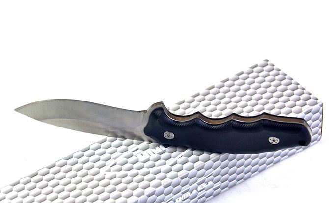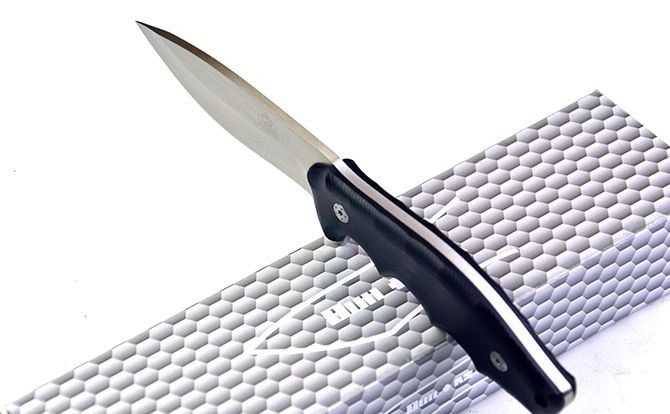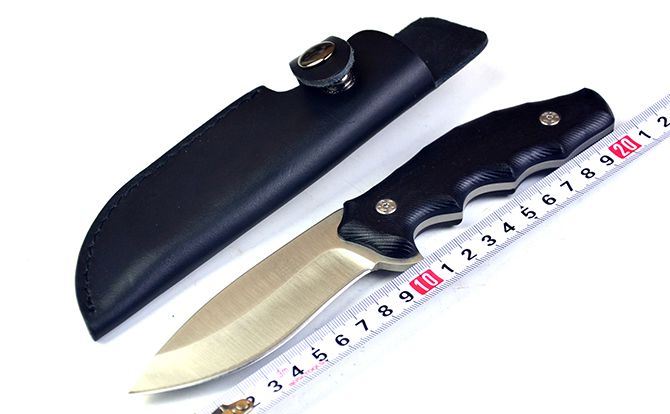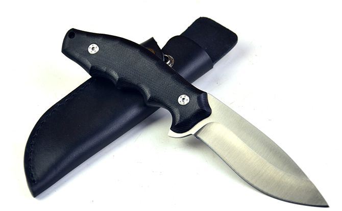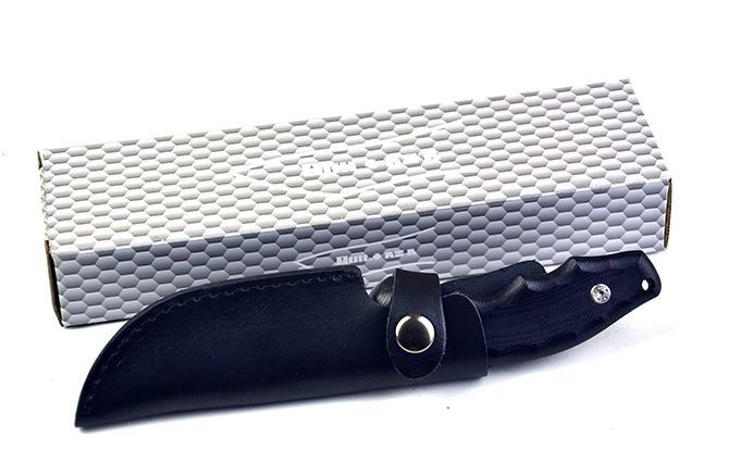 全 长:220mm 刃 长:100mm 柄 长:120mm 刃 宽:32mm 刃 厚:4.5mm 刃 材:9Cr18Mov 重 量:253g(含包装) 硬 度:59HRC 表 面:砂光 柄 材:黑G10 锁 型:定锁 其 他:配牛皮套
