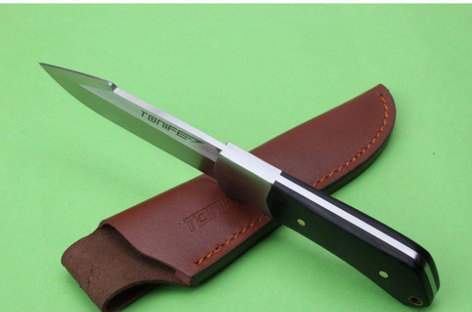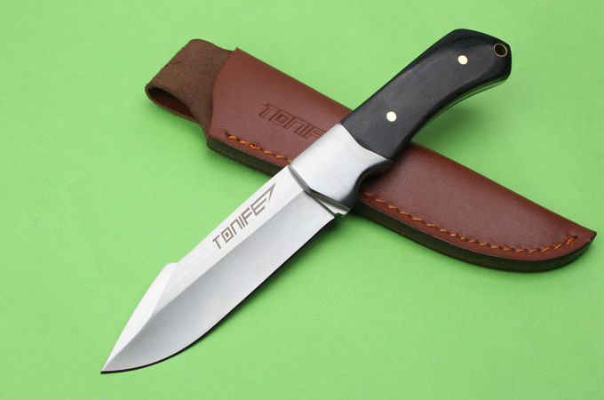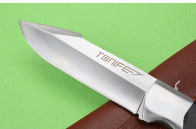 TONIFE途耐银战直刀 全 长:215mm 刃 长:105mm 柄 长:111mm 刃 宽:29mm 刃 厚:3.4mm 刃 材:优质8铬钢 重 量:266g(含包装) 硬 度:57-58HRC 以上 表 面:砂光 柄 材:一体钢+钢头+黑檀木 锁 型:定锁 其 他:配牛皮套