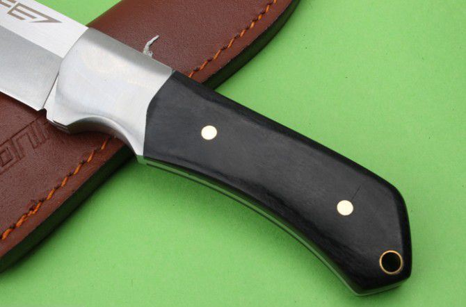 全 长:215mm 刃 长:105mm 柄 长:111mm 刃 宽:29mm 刃 厚:3.4mm 刃 材:优质8铬钢 重 量:266g(含包装) 硬 度:57-58HRC 以上 表 面:砂光 柄 材:一体钢+钢头+黑檀木 锁 型:定锁 其 他:配牛皮套