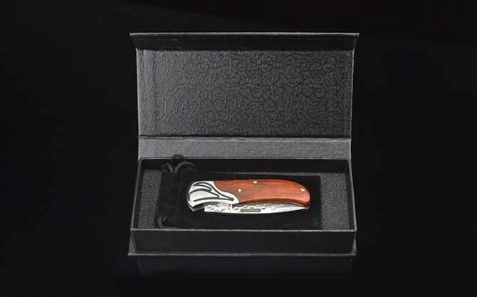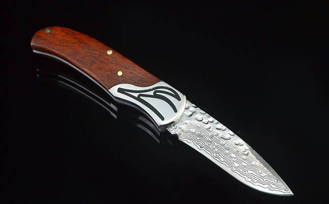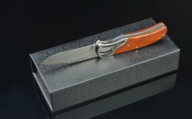 神爪锻纹大马士革小折刀 刃材:大马士革钢 硬度:59HRC 全长:15.5CM 刃长:6.3CM 刃厚: 2.9MM 刃宽:2CM (最宽处) 柄长: 8.8CM 柄材: 钢头+红酸枝 净重:75克 毛重:156克 包装:高档磁吸盒、小黑绒布袋 锁定: 无锁