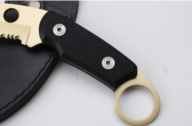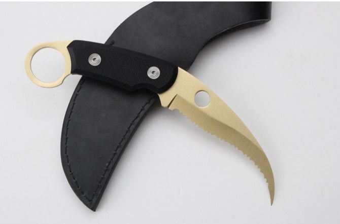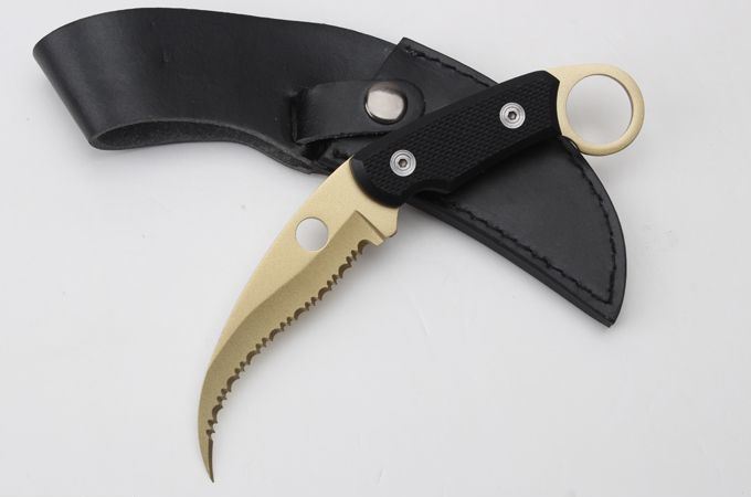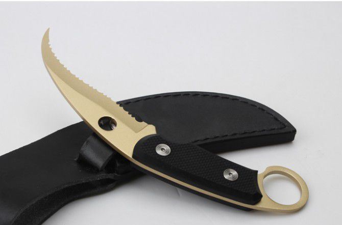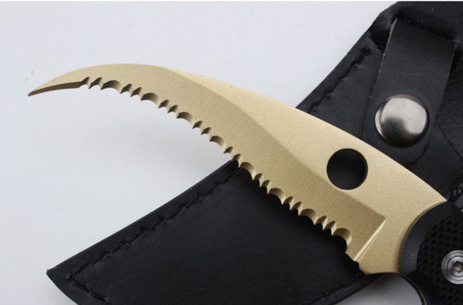 土豪金全齿文官爪刀(直款) 全 长:20cm 刃 长:10cn 刃 宽:3cm 厚 度:3mm 钢 材:420 手 柄:g10 刀 套:皮鞘