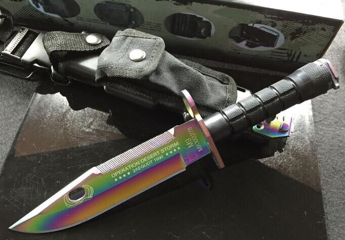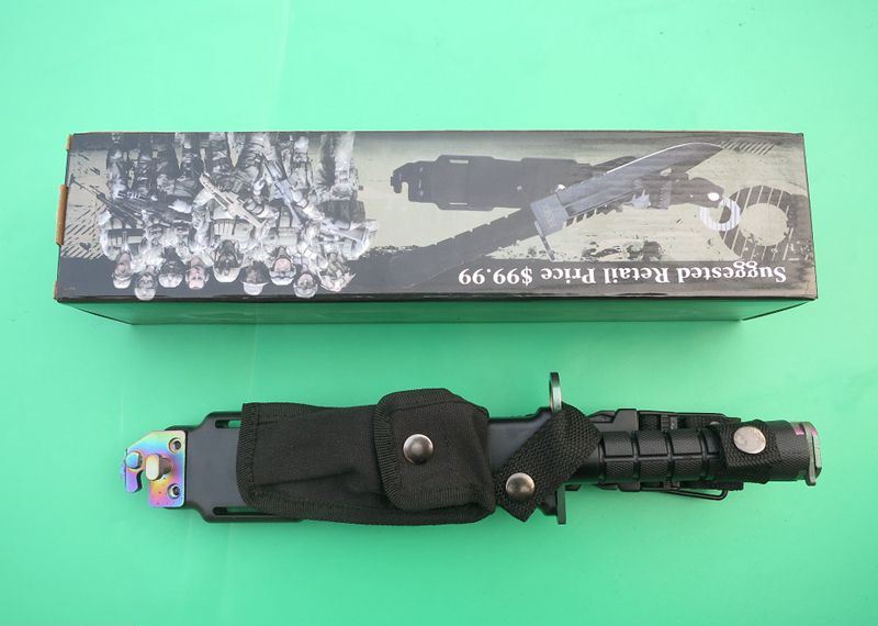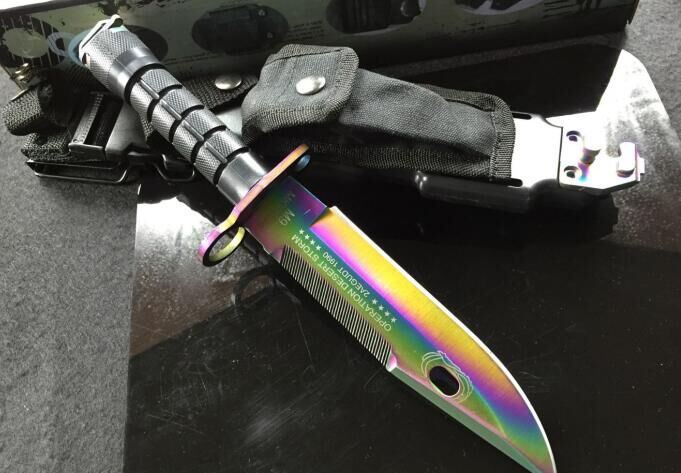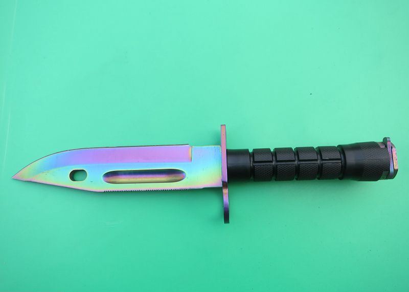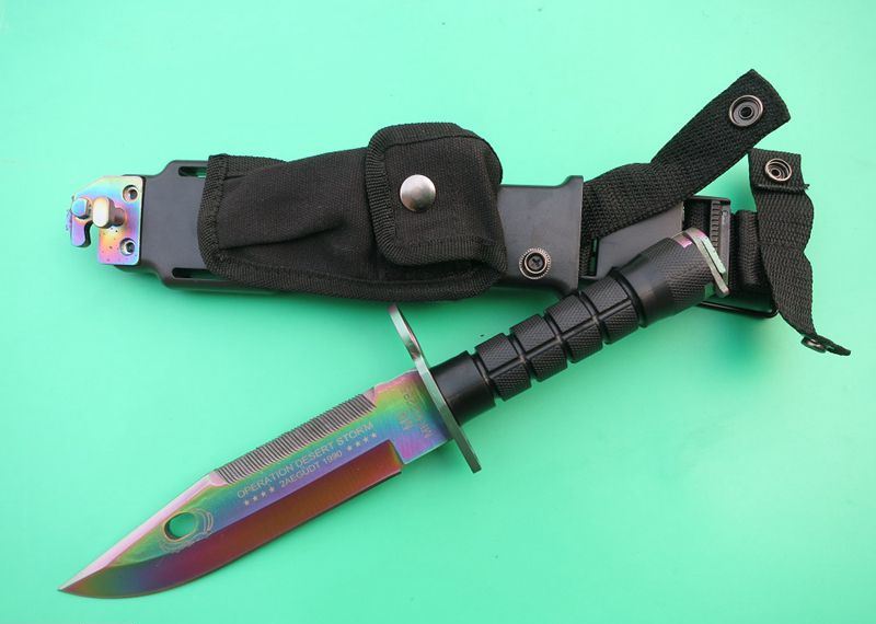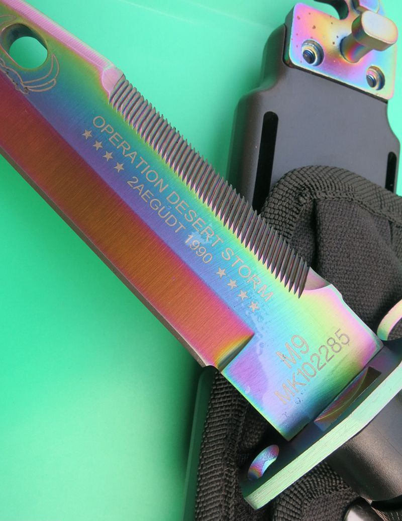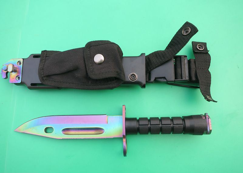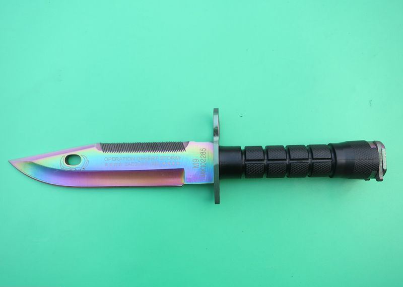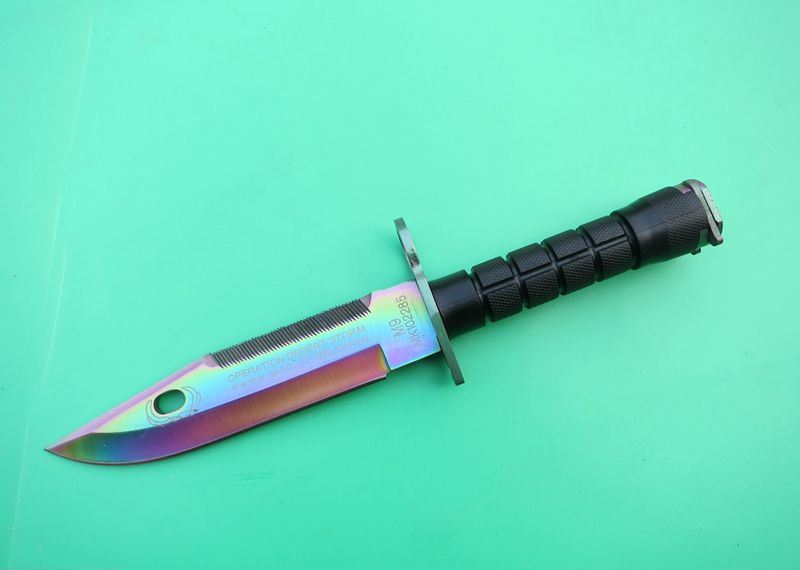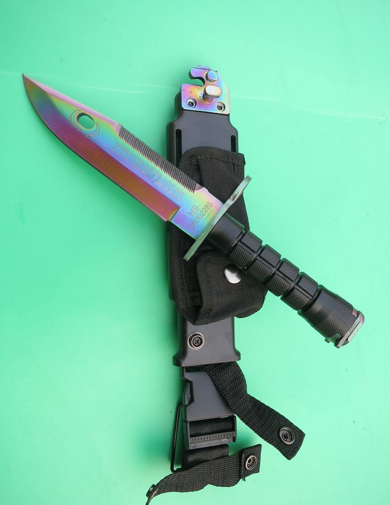 幻彩精仿m9军刀 全 长:32cm 刃 长:19.8cm 刃 厚:5.9mm 刃 材:5CR13 硬 度:56HRC 重 量:刀410g+鞘400g 表 面:镀彩 柄 材:ABS 刀 鞘: ABS
