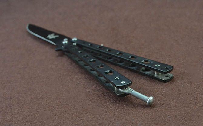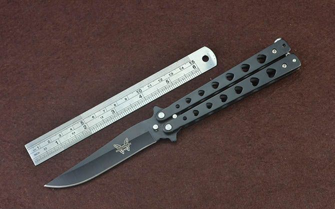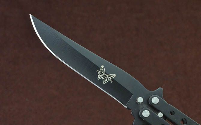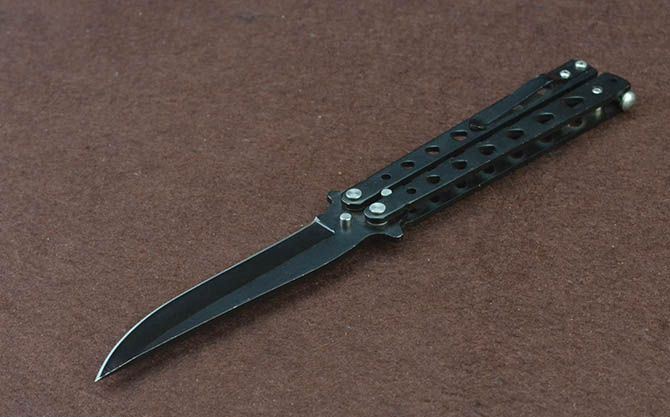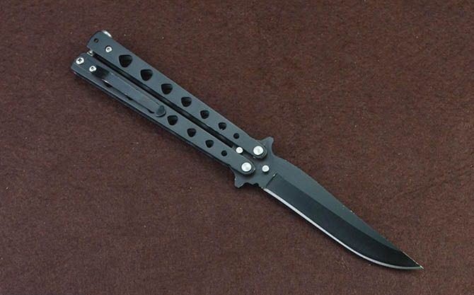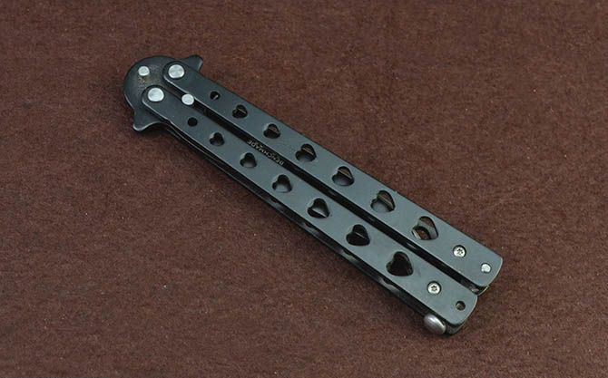 蝴蝶七心甩刀(大号) 全 长:22.3cm 刃 长:9.3cm 柄 长:12.2cm 刃 宽:2.1cm 刃 厚:2.5mm 刃 材:3Cr13Mov 重 量:118g(含包装) 硬 度:54HRC 表 面:发黑 柄 材:发黑