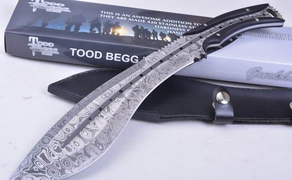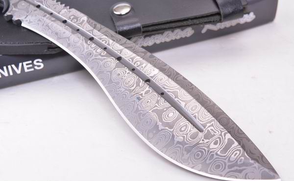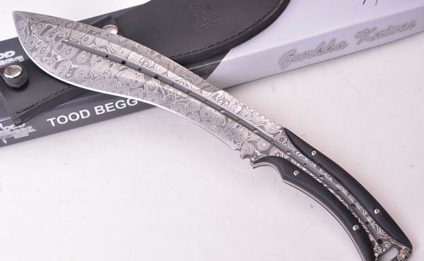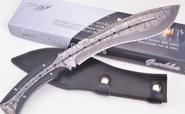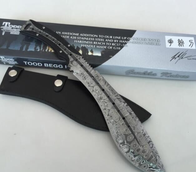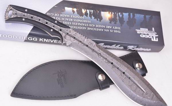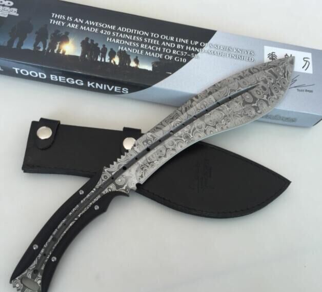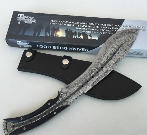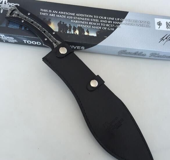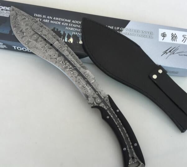 托德征服者狗腿刀(水波纹) 全 长:39cm 刃 长:24cm 刃 宽:6cm(最宽处) 刃 厚:6.2mm 柄 长:13cm 表 面: 腐蚀纹 刃 材: 5Cr15 硬 度: 58HRC 柄 材: G10防滑柄片 结 构:龙骨一体贯穿整体 重 量:800克(含包装) 包 装:皮套+彩盒