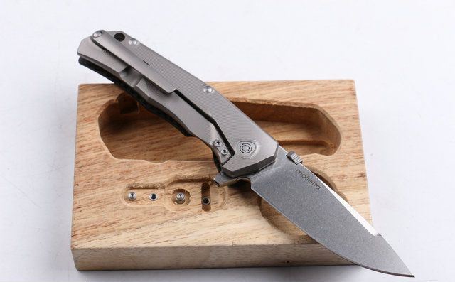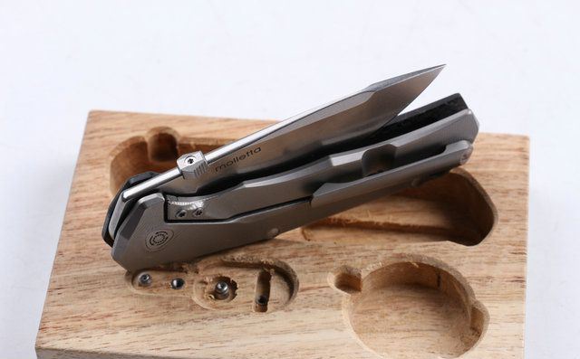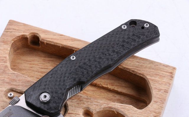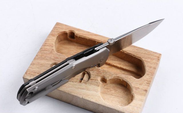 总 长:173mm 刃 长:75mm 刃 厚:3.4mm 刃 材:D2 刃 面处理:石洗 手 柄:10mm 手 柄材质;正面碳纤+钛合金 反面:TC4(钛合金) 系 统:滚珠系统 硬 度:58-59° 重 量: 150克 热 处理:真空热处理 包 装:原厂木盒+说明书+配4套小螺丝