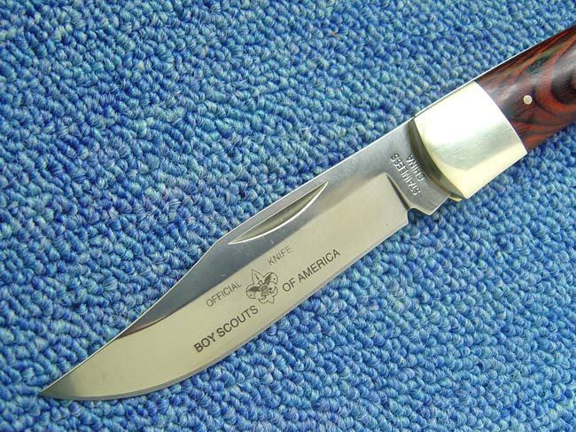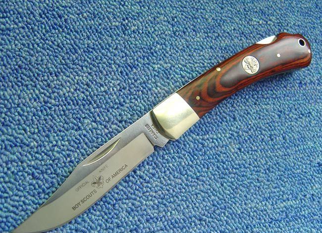 全长:22.3CM 刃长:9CM 刃厚:0.3CM 柄长:12.5CM 刃材料:440 柄材料:铜柄+木 锁:背锁 BOY SCOUTS OF AMERICA(美国童子军),它是一种野外活动的训练方式,这种方法用以培养青少年成为快乐健康有用的公民。目前全世界约有两亿五千多万名童子军,童子军(boy scout)是指十一岁以上的儿童。美国童子军定制产品,野外求生刀类,刨尖型刀刃(类似BUCK110),刀柄镶嵌徽章!