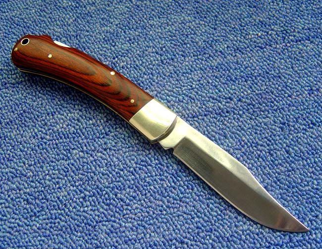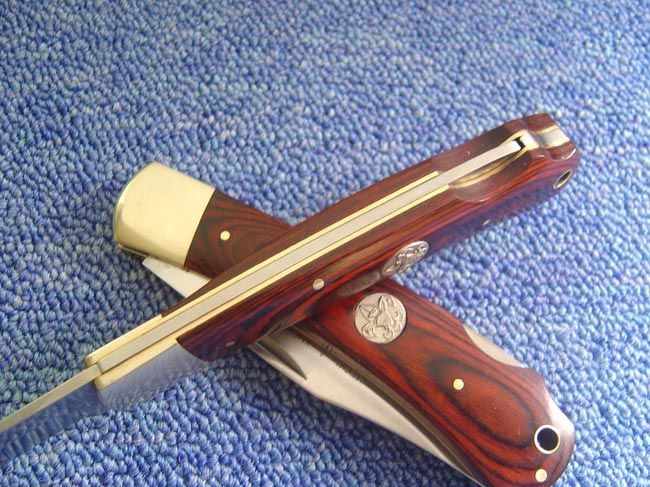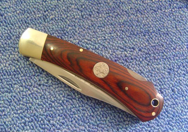 美国Boy scouts童子军铜柄折刀 全长:22.3CM 刃长:9CM 刃厚:0.3CM 柄长:12.5CM 刃材料:440 柄材料:铜柄+木 锁:背锁 BOY SCOUTS OF AMERICA(美国童子军),它是一种野外活动的训练方式,这种方法用以培养青少年成为快乐健康有用的公民。目前全世界约有两亿五千多万名童子军,童子军(boy scout)是指十一岁以上的儿童。美国童子军定制产品,野外求生刀类,刨尖型刀刃(类似BUCK110),刀柄镶嵌徽章!