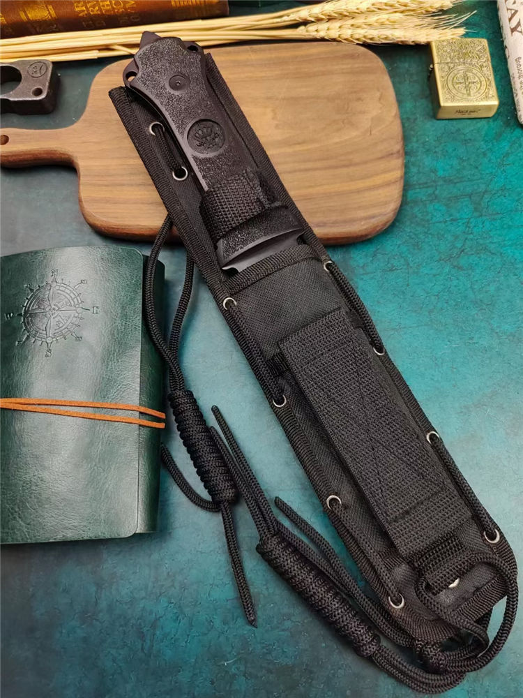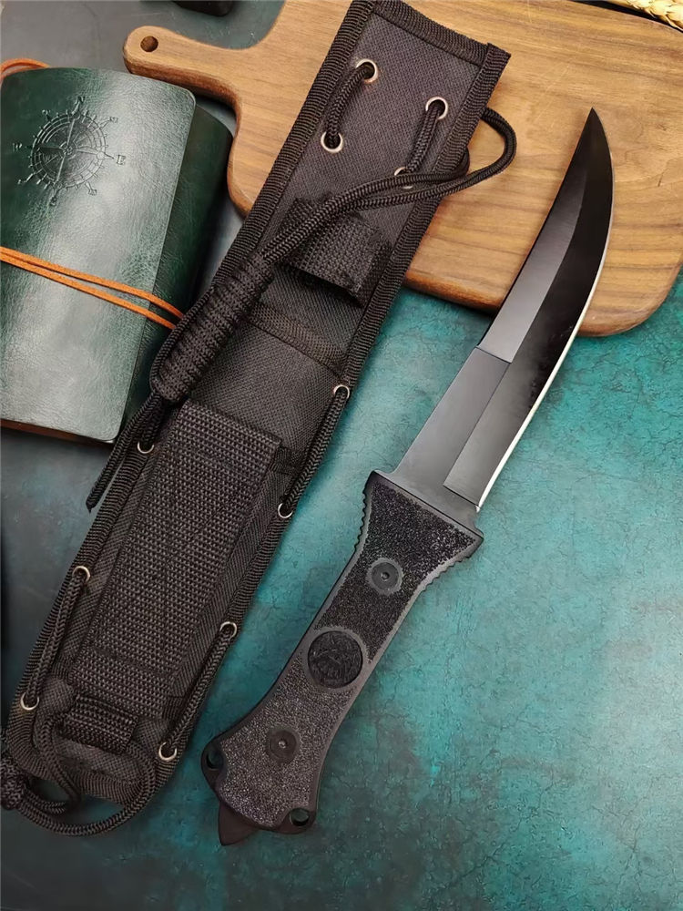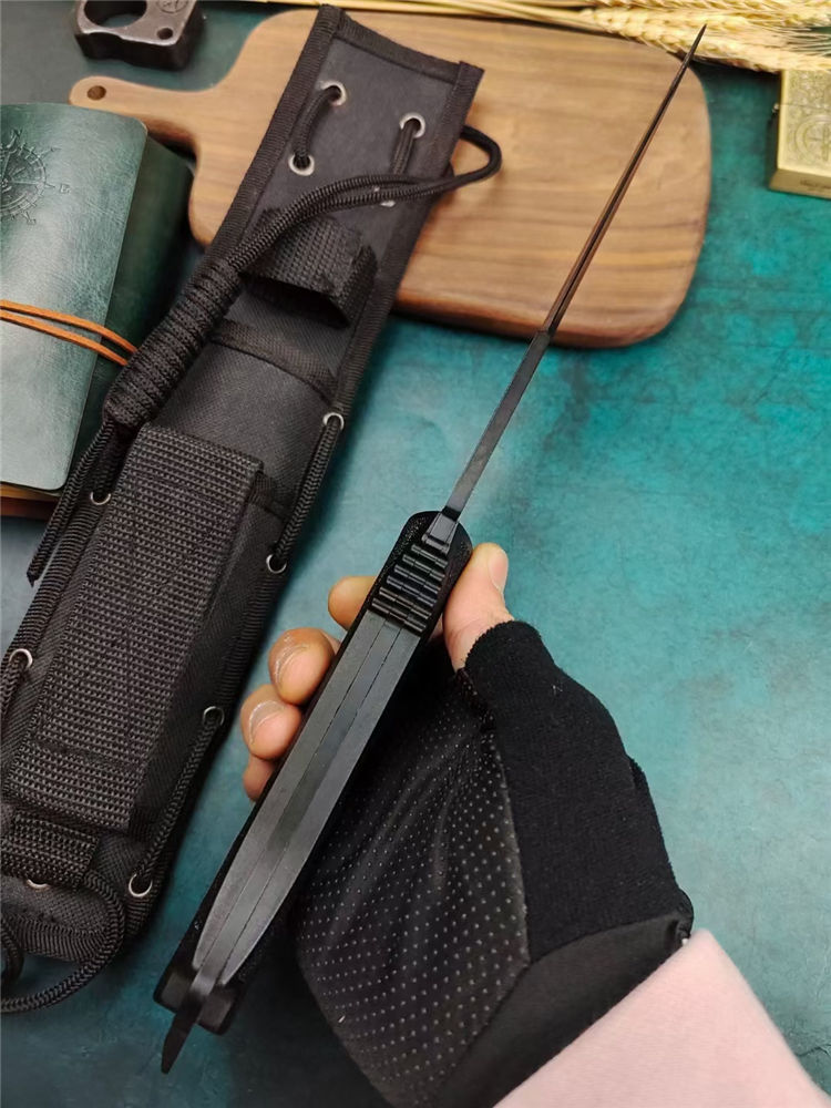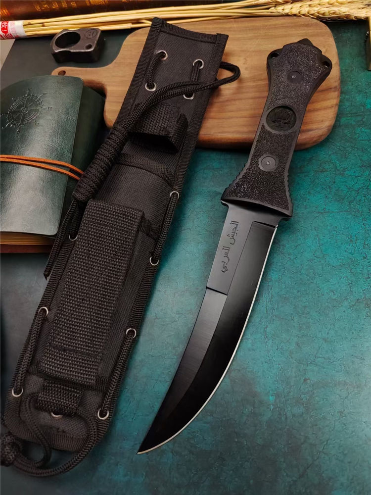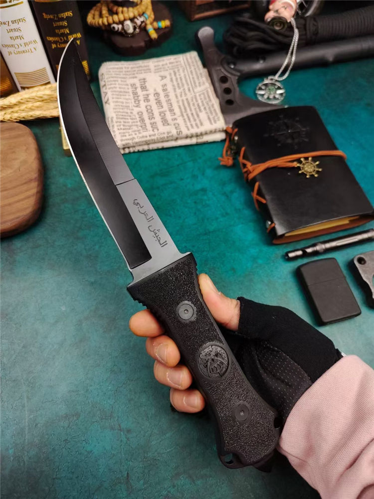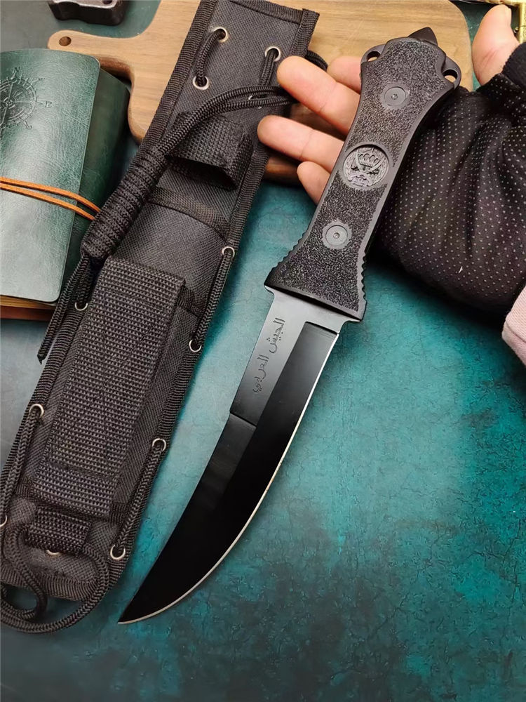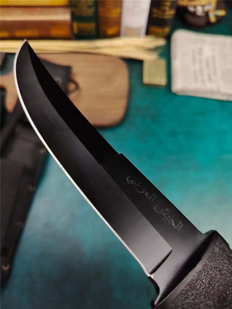 阿拉伯复古刀 全长:33.7cm 刃长:17.5cm 刃宽:3.6cm (最宽处) 刃厚:0.5cm 刃材:440 硬度:57HRC 表面:高温黑漆 柄材:ABS工程塑料,表面防滑沙粒纹 柄长:15.5cm 刀重:380克 总重:600克(含包装物) 品质:出口代工品,质量可靠 其他:刀身贯穿至刀柄末端,用梅花丝钉固定;末端开有两个孔,可穿绳子;最末端是一个冲击尖头 附件:尼龙战术刀套和原装彩合