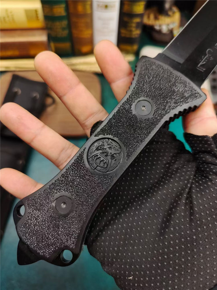 全长:33.7cm 刃长:17.5cm 刃宽:3.6cm (最宽处) 刃厚:0.5cm 刃材:440 硬度:57HRC 表面:高温黑漆 柄材:ABS工程塑料,表面防滑沙粒纹 柄长:15.5cm 刀重:380克 总重:600克(含包装物) 品质:出口代工品,质量可靠 其他:刀身贯穿至刀柄末端,用梅花丝钉固定;末端开有两个孔,可穿绳子;最末端是一个冲击尖头 附件:尼龙战术刀套和原装彩合